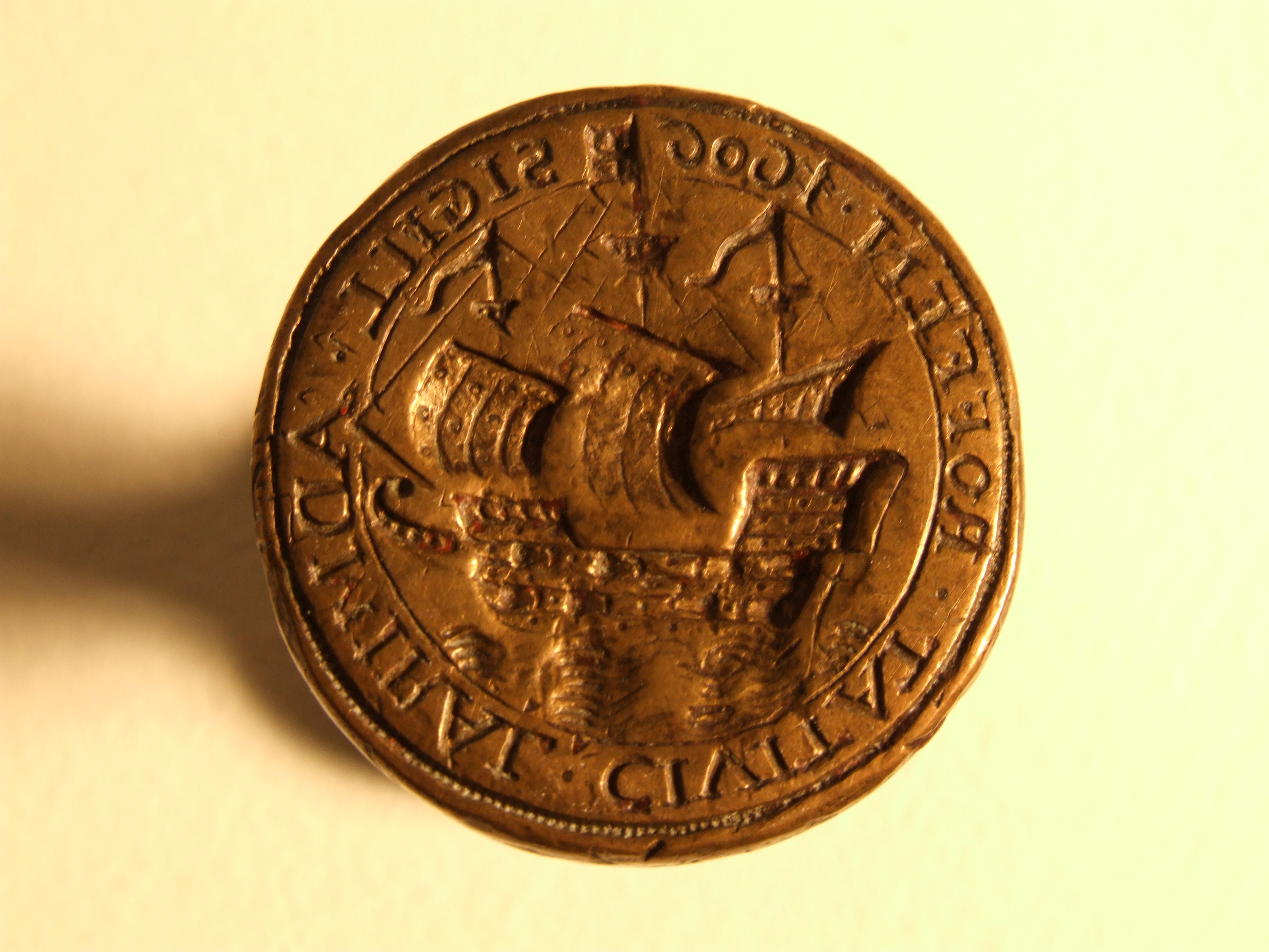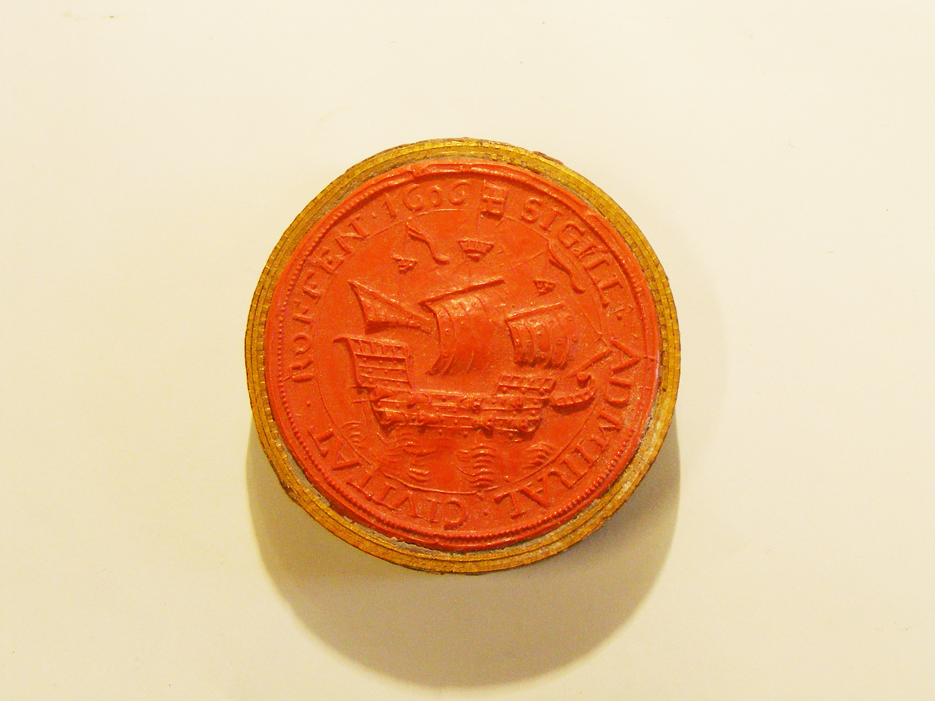 - DescriptionBrass (copper alloy) seal matrix of the City of Rochester Oyster and Floating Fishery (Admiralty Court); double-ended; dumbell-shaped seal; larger end has a 3-masted ship & 'SIGILL ADMIRAL CIVITAT ROFFEN 1606'; other end has a fish & 'S C ROFFEN 1606'. An electrotype copy of this seal was made by Peter Shorer (mid 1970's?) for use by the Admiralty Court in place of the original.