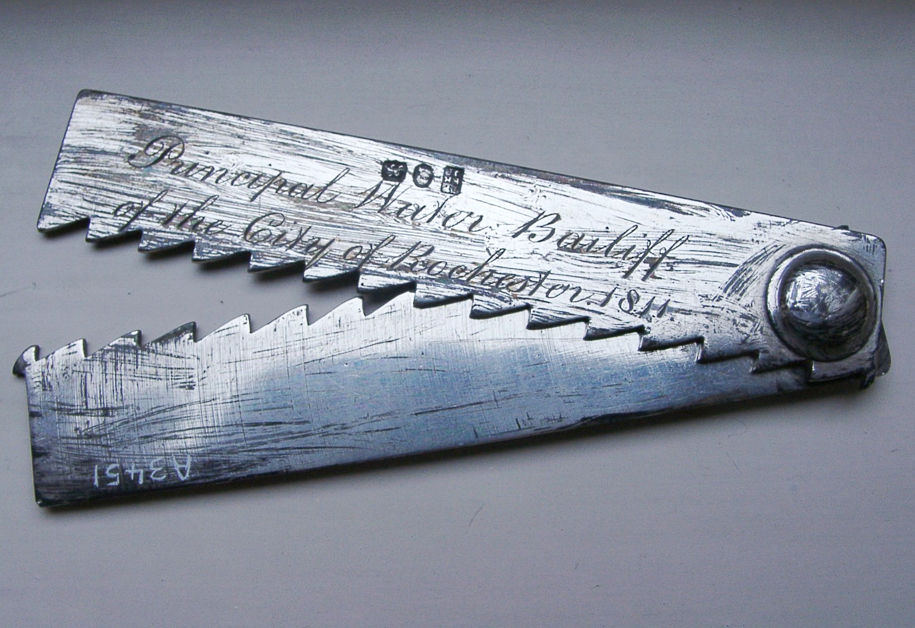 Silver folding fish measure; hallmarked London sterling silver, dating to 1811; the measure is marked out with 7", one long edge is saw-toothed; folds in the middle. Used to measure the guage of fishing nets to control the size of fish caught. Used by the Water Bailiffs of the River Medway, with the authority to challenge anyone fishing on the river. Very young fish were not allowed to be taken as this was leading to stock depletion. Individuals catching undersize fish could be fined or even taken to court.