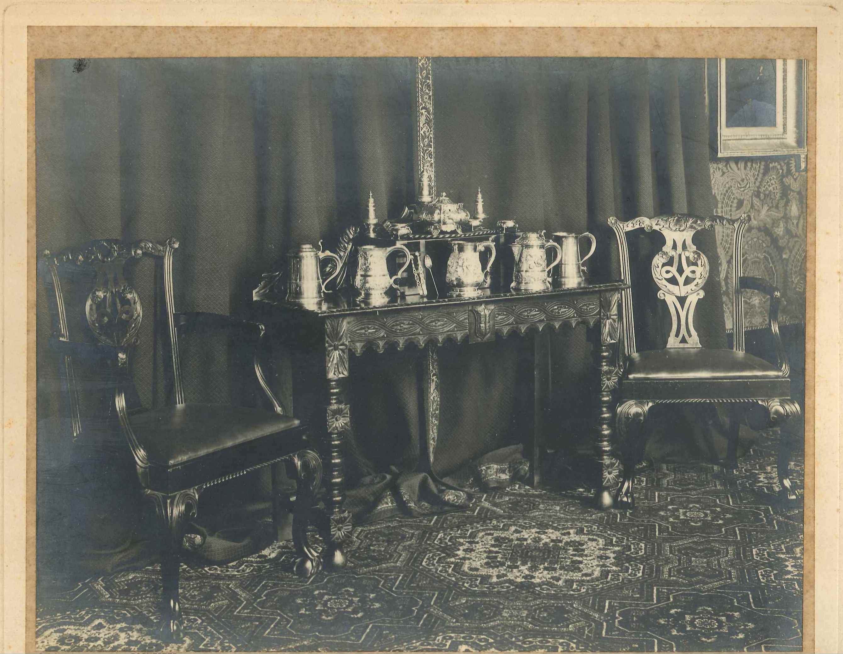 Chippendale style mahogany chair with arm rests; carved splats are decorated with 2 flowers; top rail has flower & leaf decoration; carved cabriole legs, 2 ball & claw feet, 2 plain; modern maroon plastic? upholstery; some wear and old woodworm damage; one of a set of 10. Chosen for display in the museum from Acorn House, Rochester (where this image shows them), on the death of Mr E H Elliot in April, 1935. For image see A3513/9.