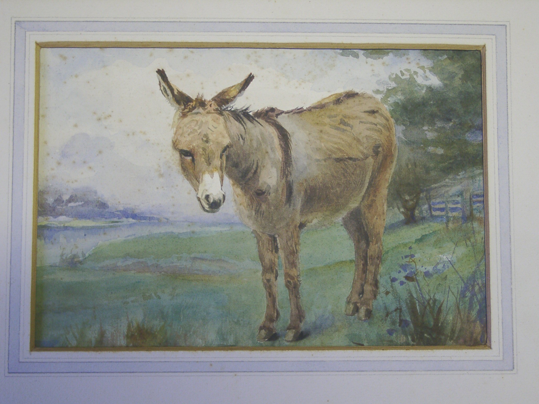 - DescriptionWatercolour painting by Charles Spencelayh; framed & mounted; shows standing donkey ('Neddy') with fence and trees in the right background, small river to the left. Dimensions are of the visible painting area excluding frame.