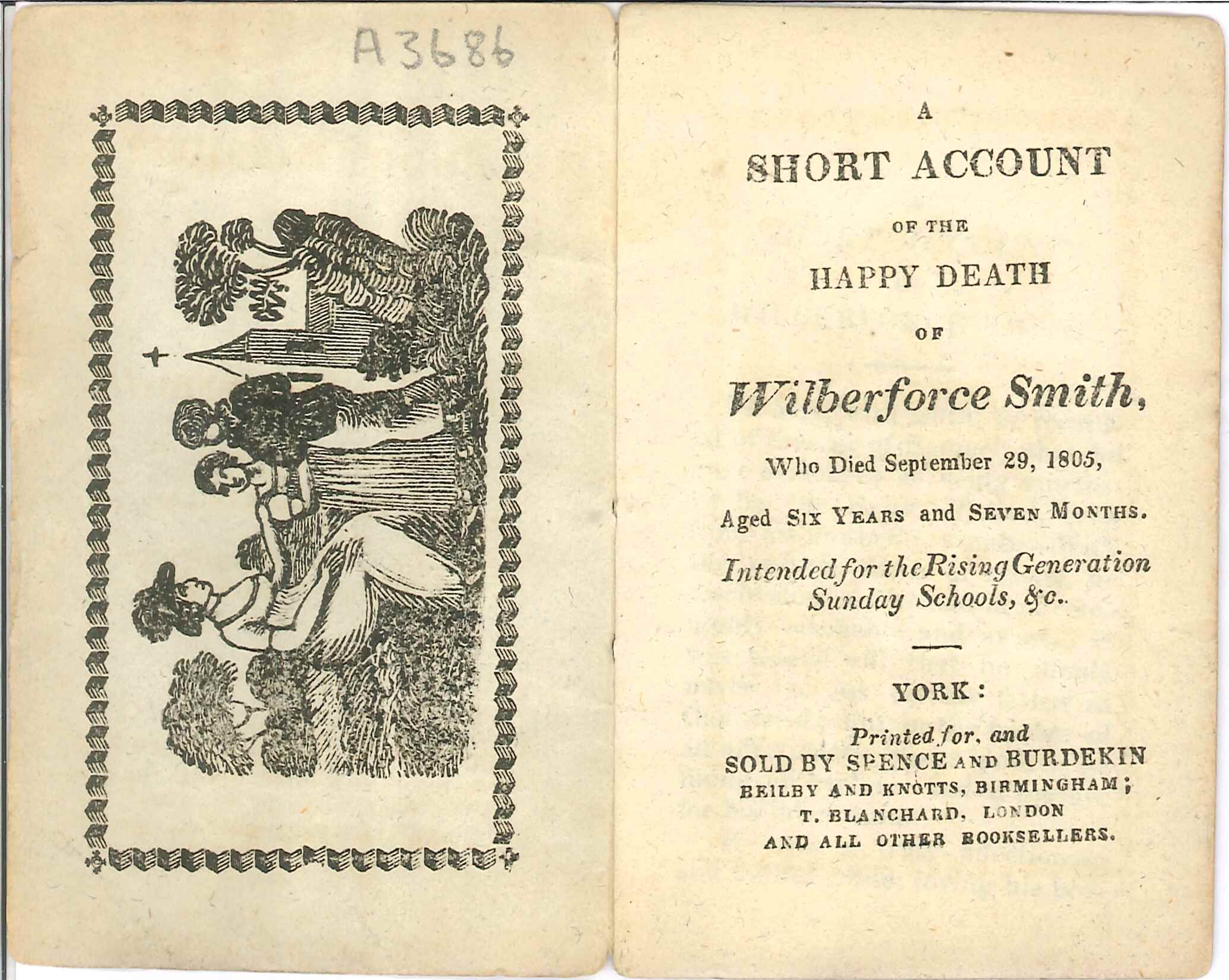 - DescriptionBooklet, 'A SHORT ACCOUNT OF THE HAPPY DEATH OF Wilberforce Smith.'; grey cover, inner front cover has engraved image of seated woman & 2 children.