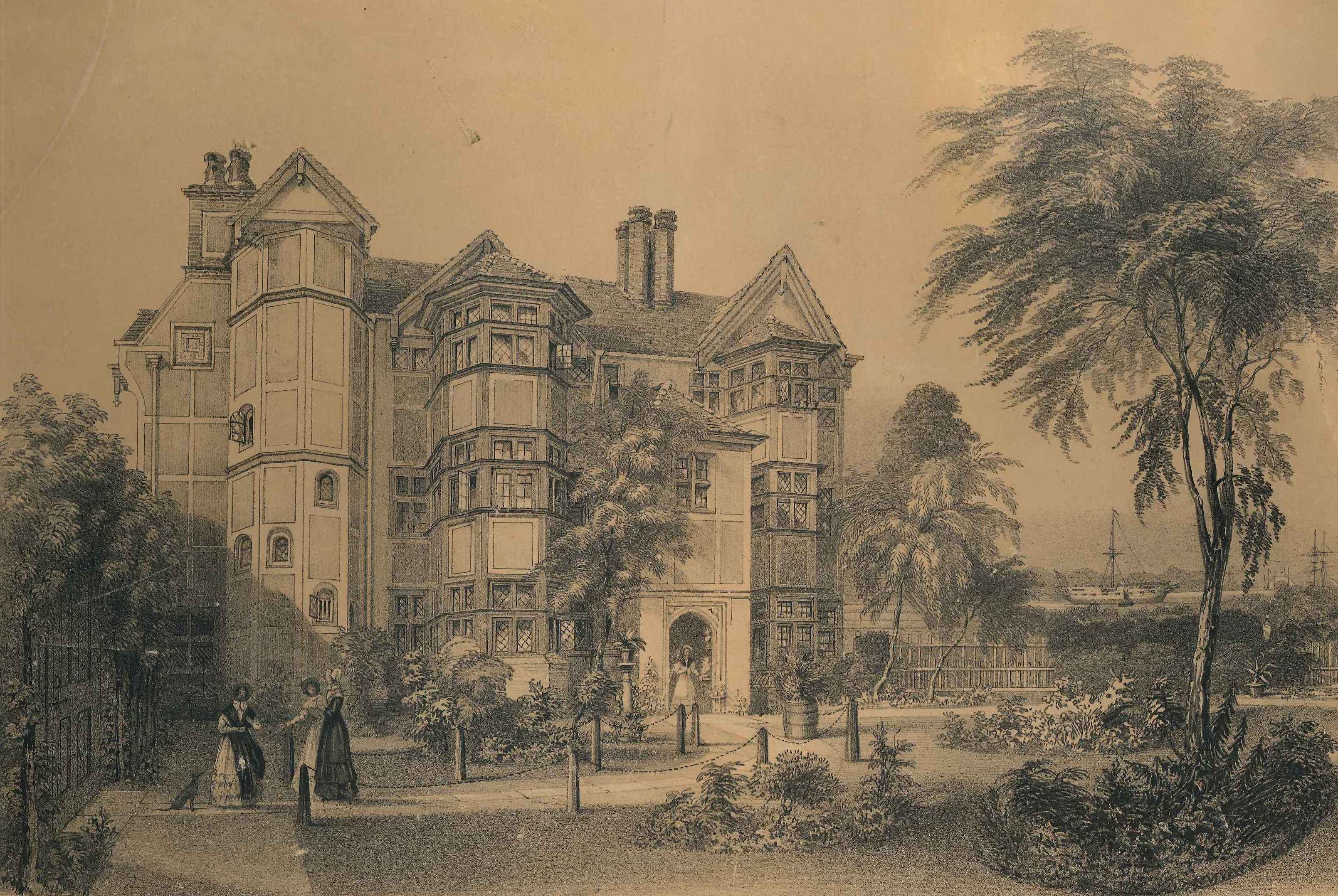 - Descriptionephemera; print of Eastgate House as it was when in use as a ladies' boarding school; viewed from the east, shows garden in front of building, 3 women with dog in left foreground, woman in entranceway, ships on Medway in background. Glazed & framed & mounted on the wall. Some minor tears and damage.