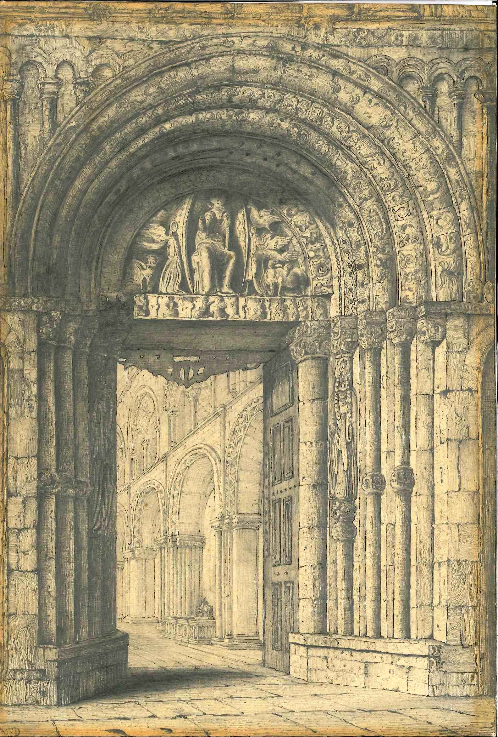 - DescriptionPencil drawing; Rochester Cathedral, west door showing details of carvings; initialled 'HFD'. Glazed & framed & mounted on the wall.