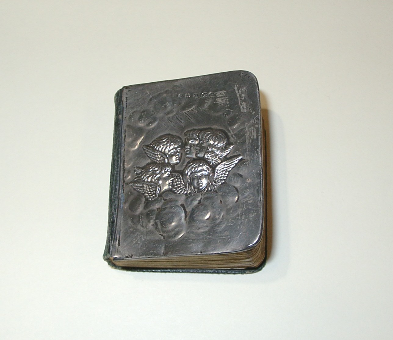 - DescriptionEphemera; miniature book of Common Prayer; has silver cover with cherub's heads design, Birmingham hallmark of Henry Matthews for 1910. Written in pencil: 'Sandra Stevens, Halcyon, Cambridge Road, Rainham' (presumably previous owner); formerly on display held in the hand of doll A3853.