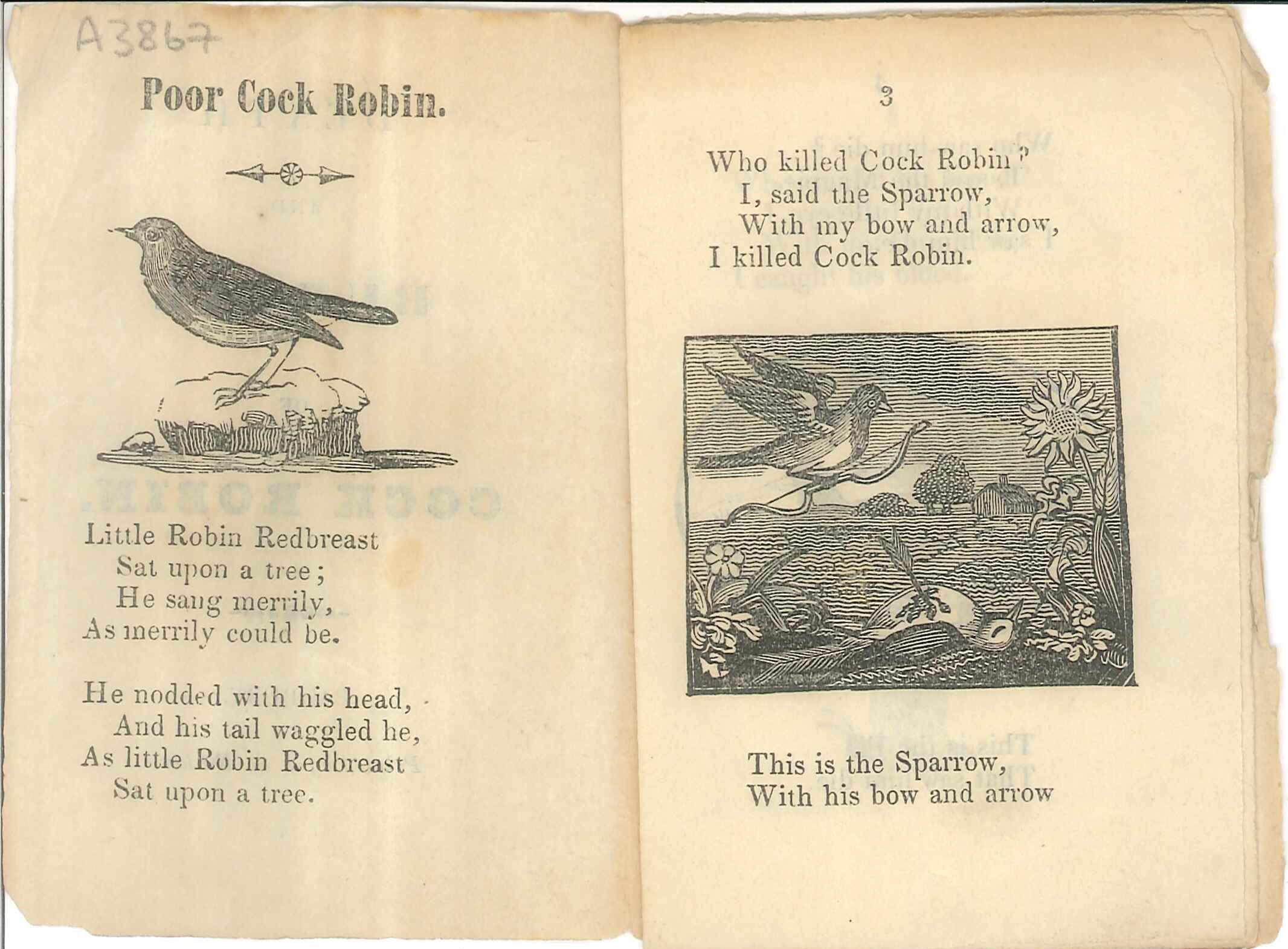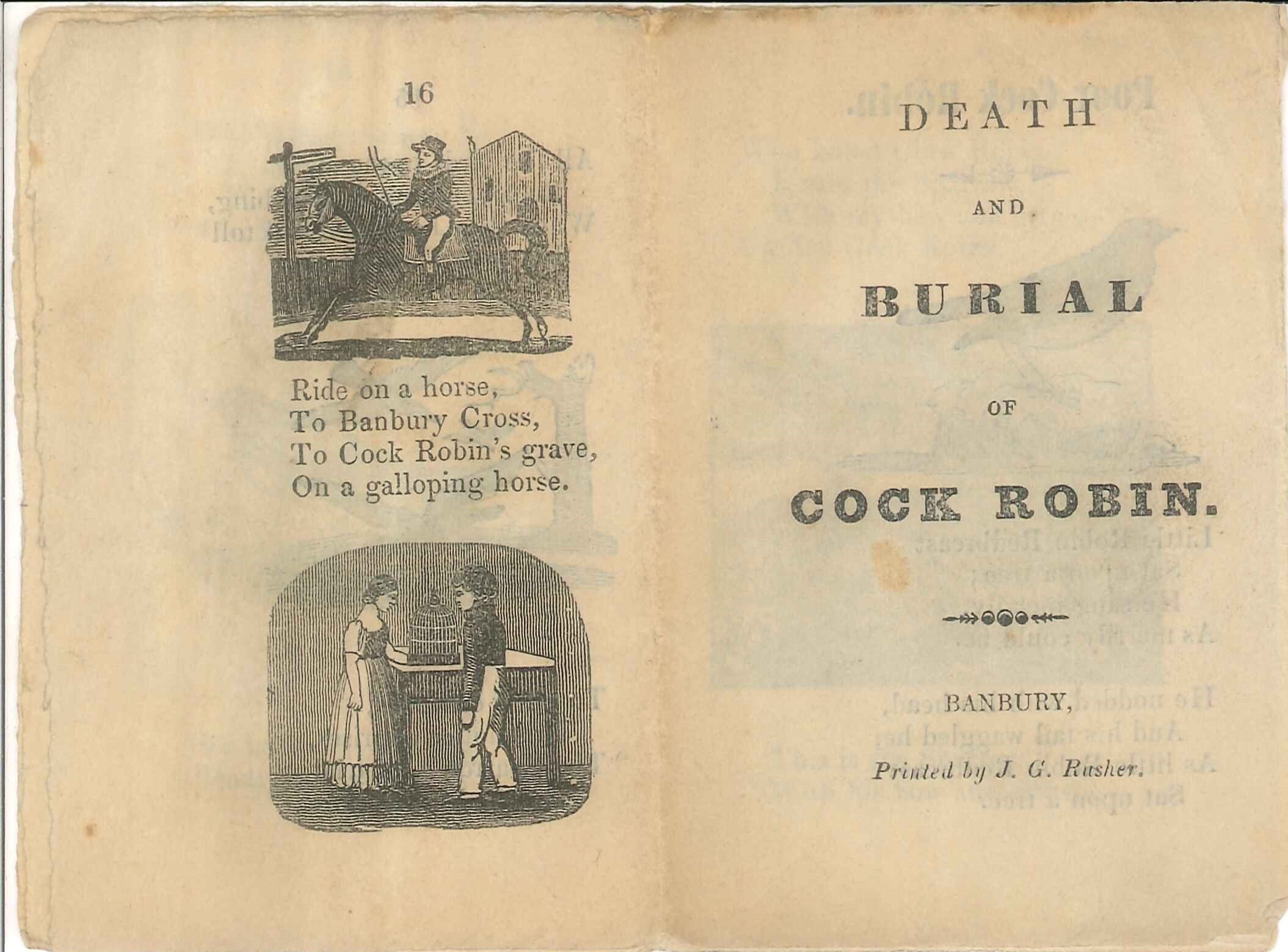 - DescriptionChild's booklet (chapbook), 'The Death and Burial of Cock Robin'; 16 pages each with simple monochrome woodcut images; published in circa 1840 by J G Rusher.