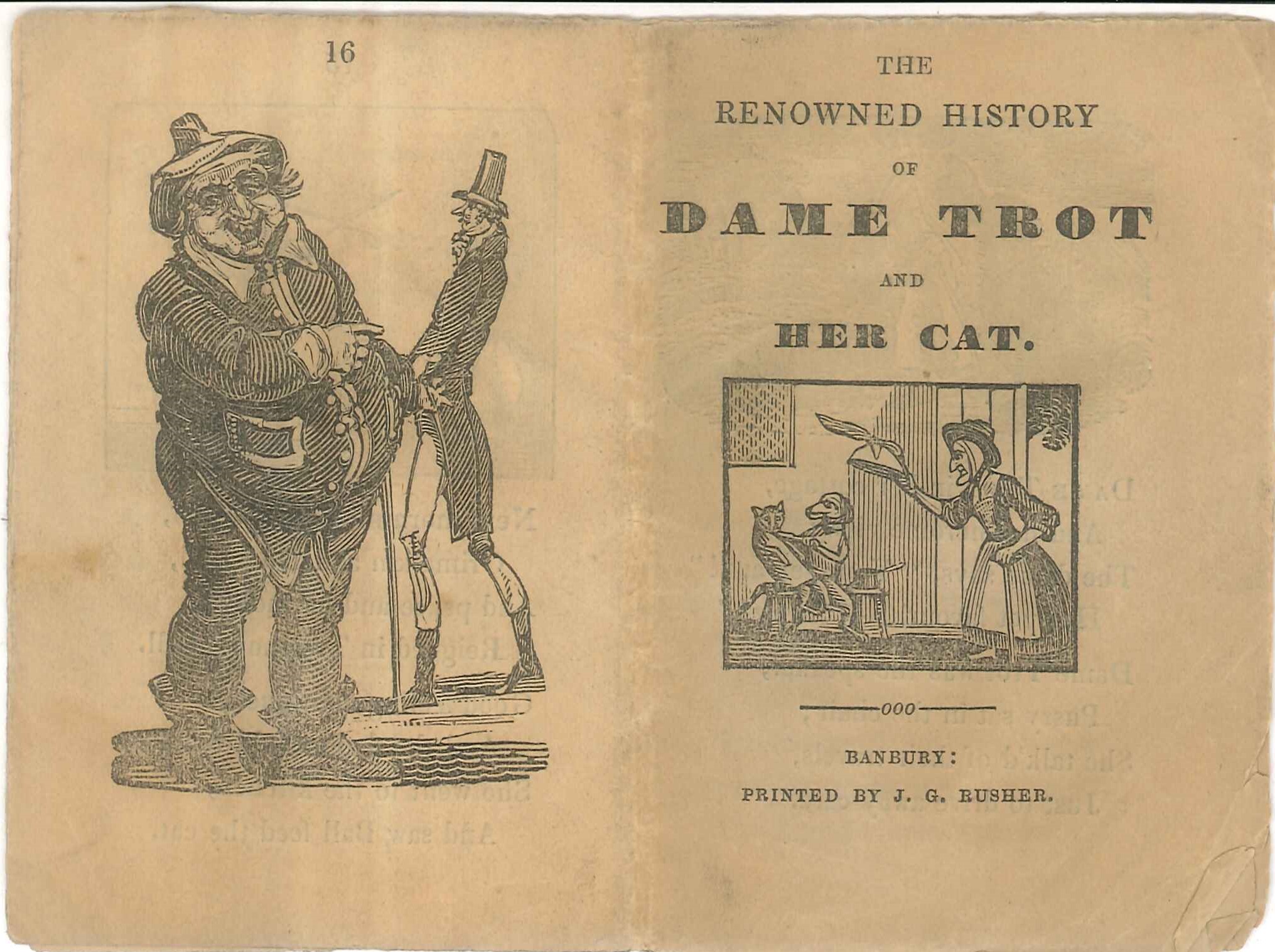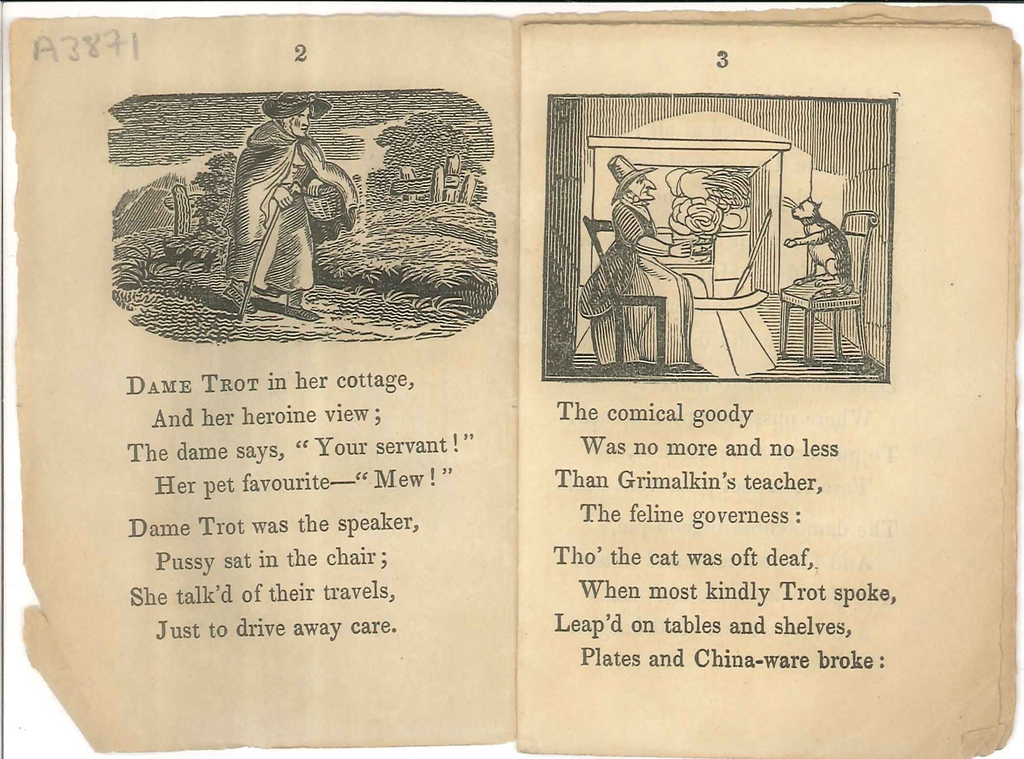 - DescriptionChild's booklet (chapbook), 'The Renowned History of Dame Trot and her cat'; 16 pages each with simple monochrome woodcut images; published in circa 1840 by J G Rusher.