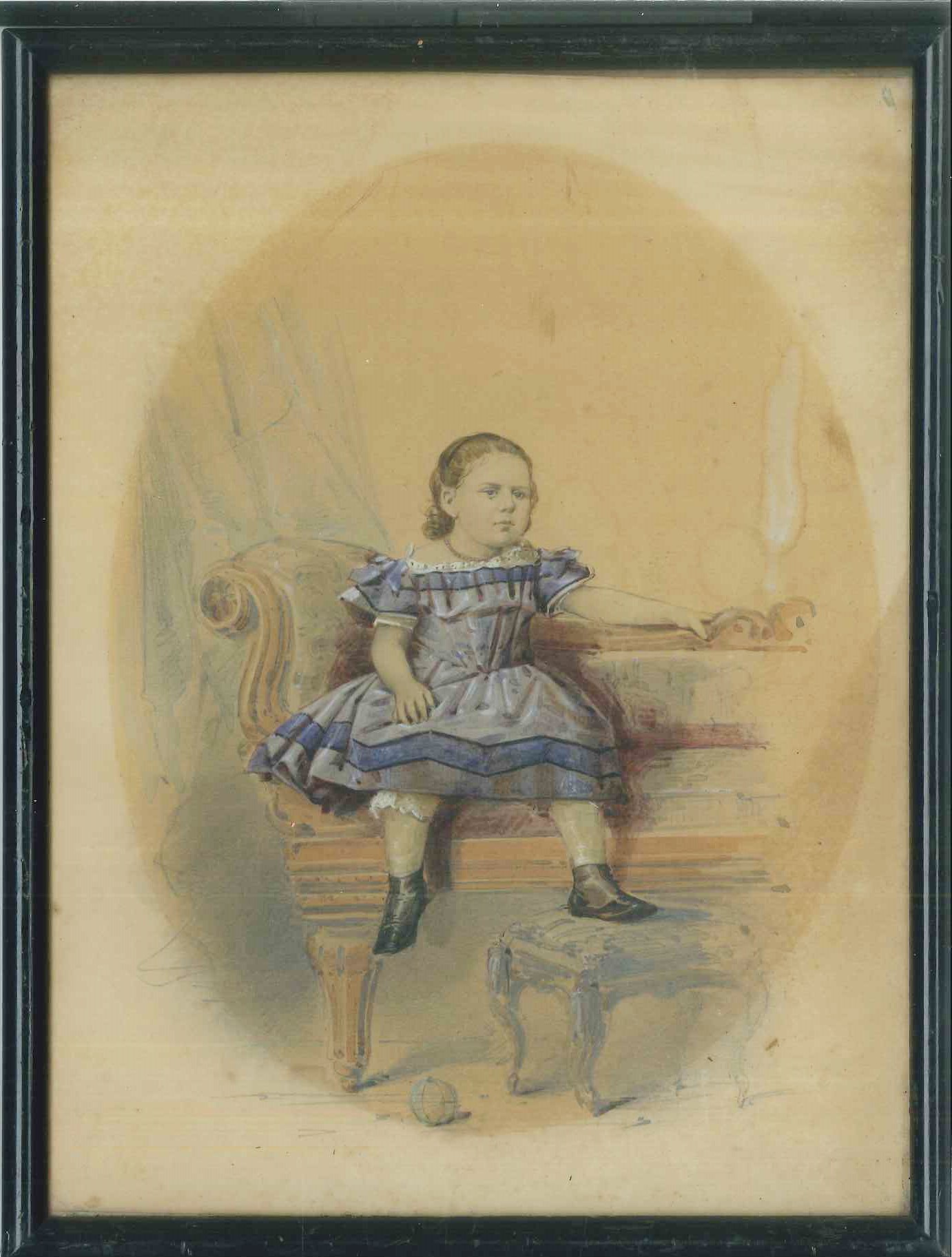 - DescriptionWatercolour painting (overpainted pencil drawing); depicts a girl in a blue dress seated on a settee; framed & glazed.