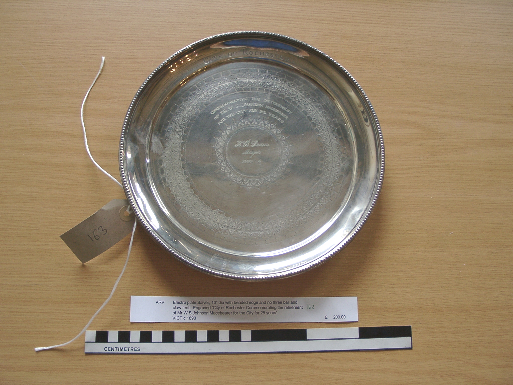 - DescriptionElectro plate silver circular tray; beaded edge, on three claw feet; commemorating the retirement of Mr W S Johnson as Rochester Macebearer.