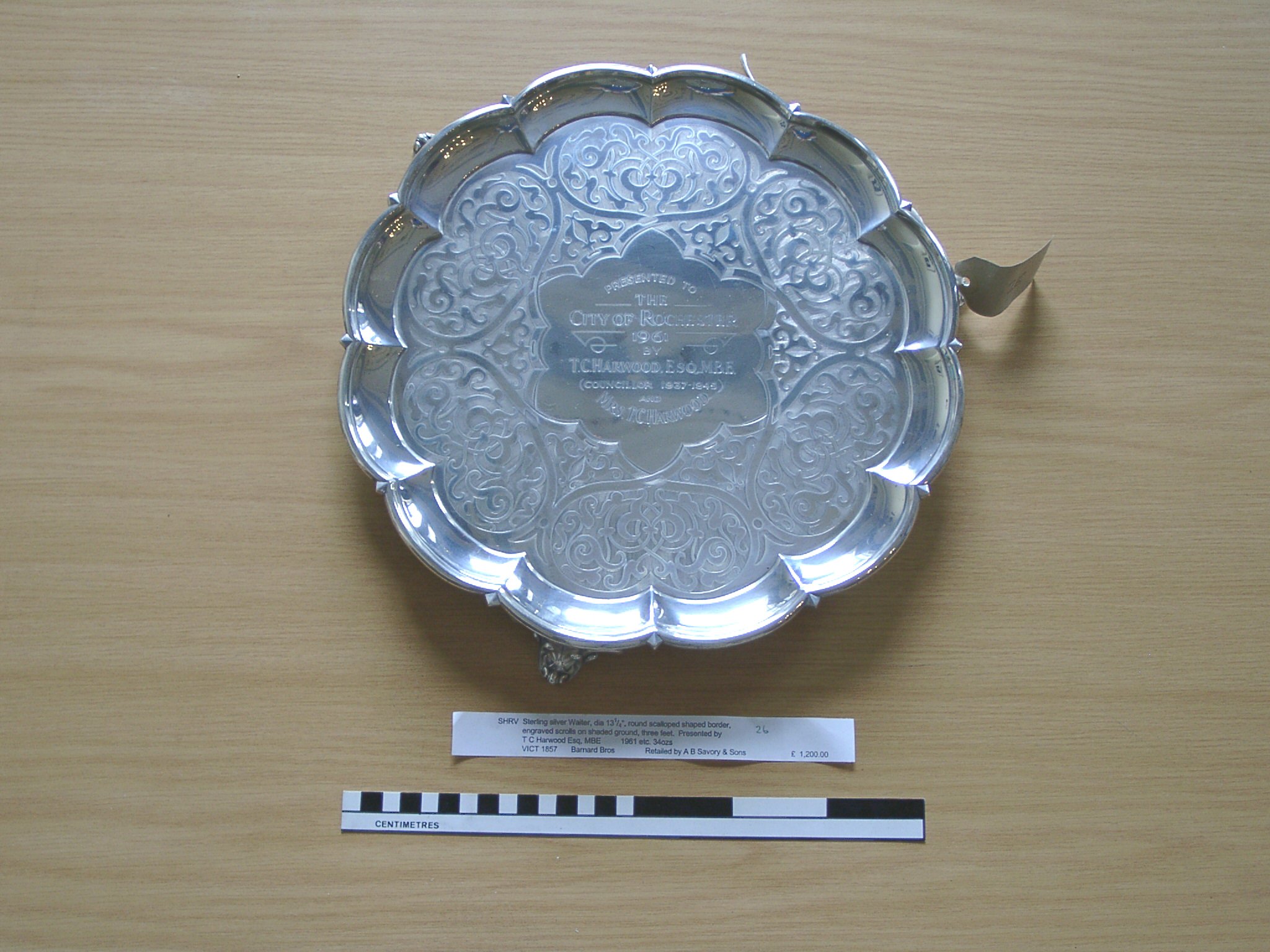 - DescriptionSterling silver circular tray; 12 scallop-shaped border, engraved scrolls on a shaded background; 3 feet; presented by Cllr T C Harwood in 1961.