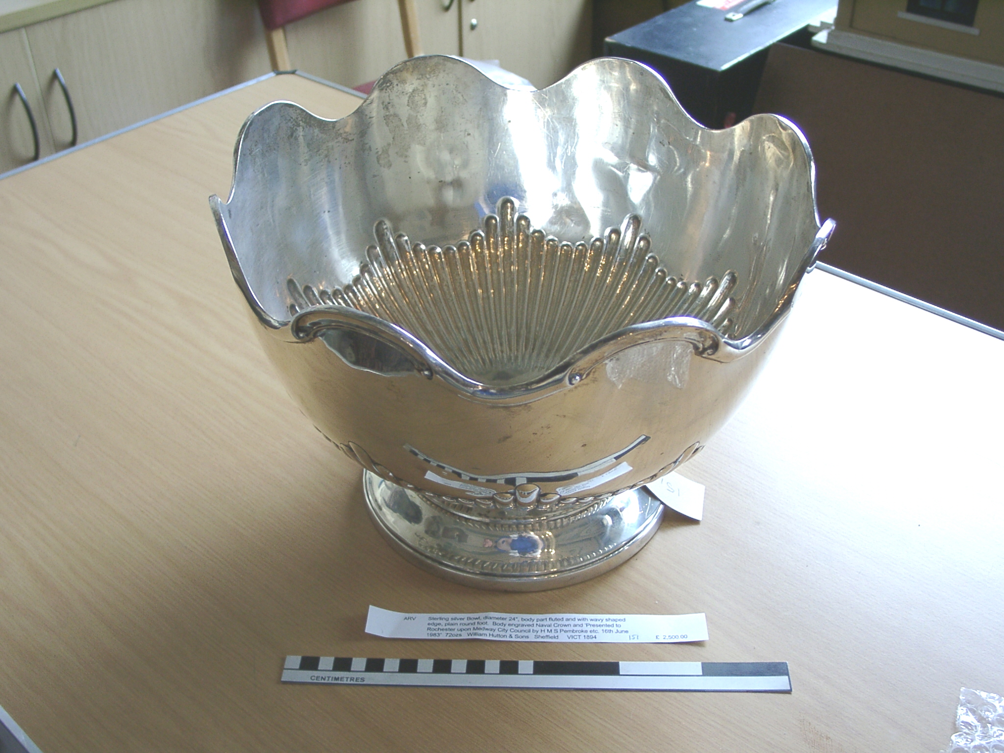 - DescriptionSterling silver bowl presented to Rochester Council by HMS Pembroke in 1983. Made by William Hutton & Sons of Sheffield in 1894. Body part fluted with wavy edge, plain round foot. 72oz.