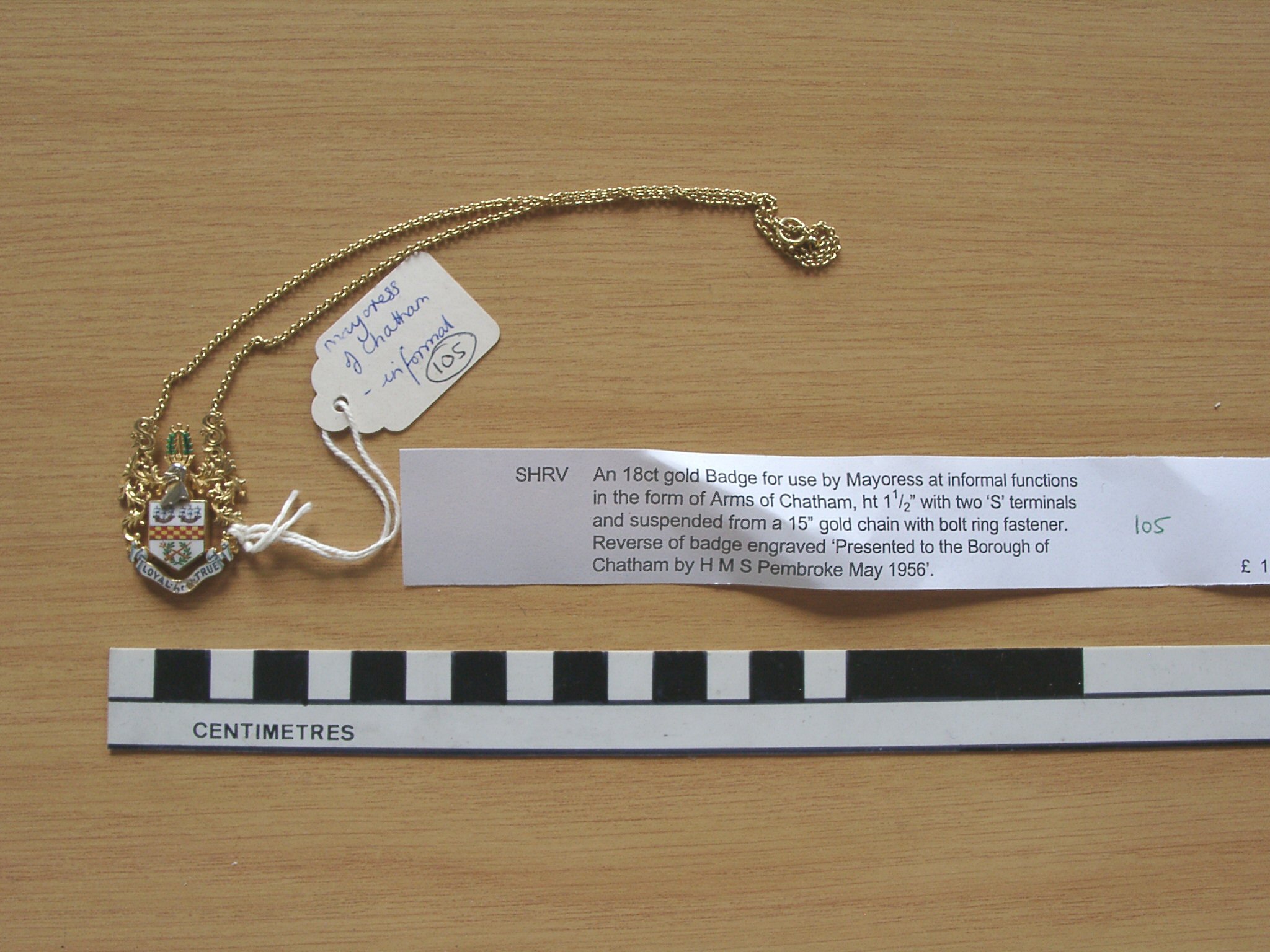 - Description18ct gold and enamel badge used by the Mayoress of Chatham at informal functions. Presented by HMS Pembroke in May 1956 after receiving the Freedom of the Borough; polychrome enamelled Chatham arms with motto (damaged); on a 15" fine linked gold chain. Weight 18g.