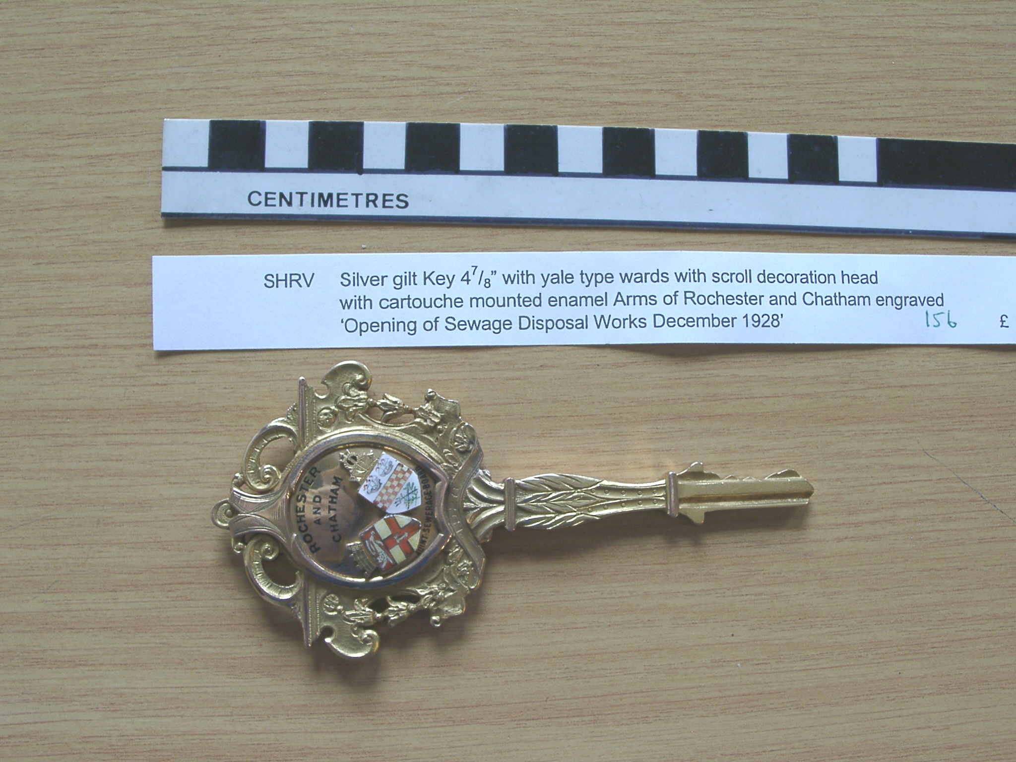 - DescriptionSilver gilt presentation key; Yale type wards, scroll decoration head, with cartouche mounted polychrome enamelled arms of Rochester & Chatham; used for opening of Sewage works (Motney Hill) in 1928.