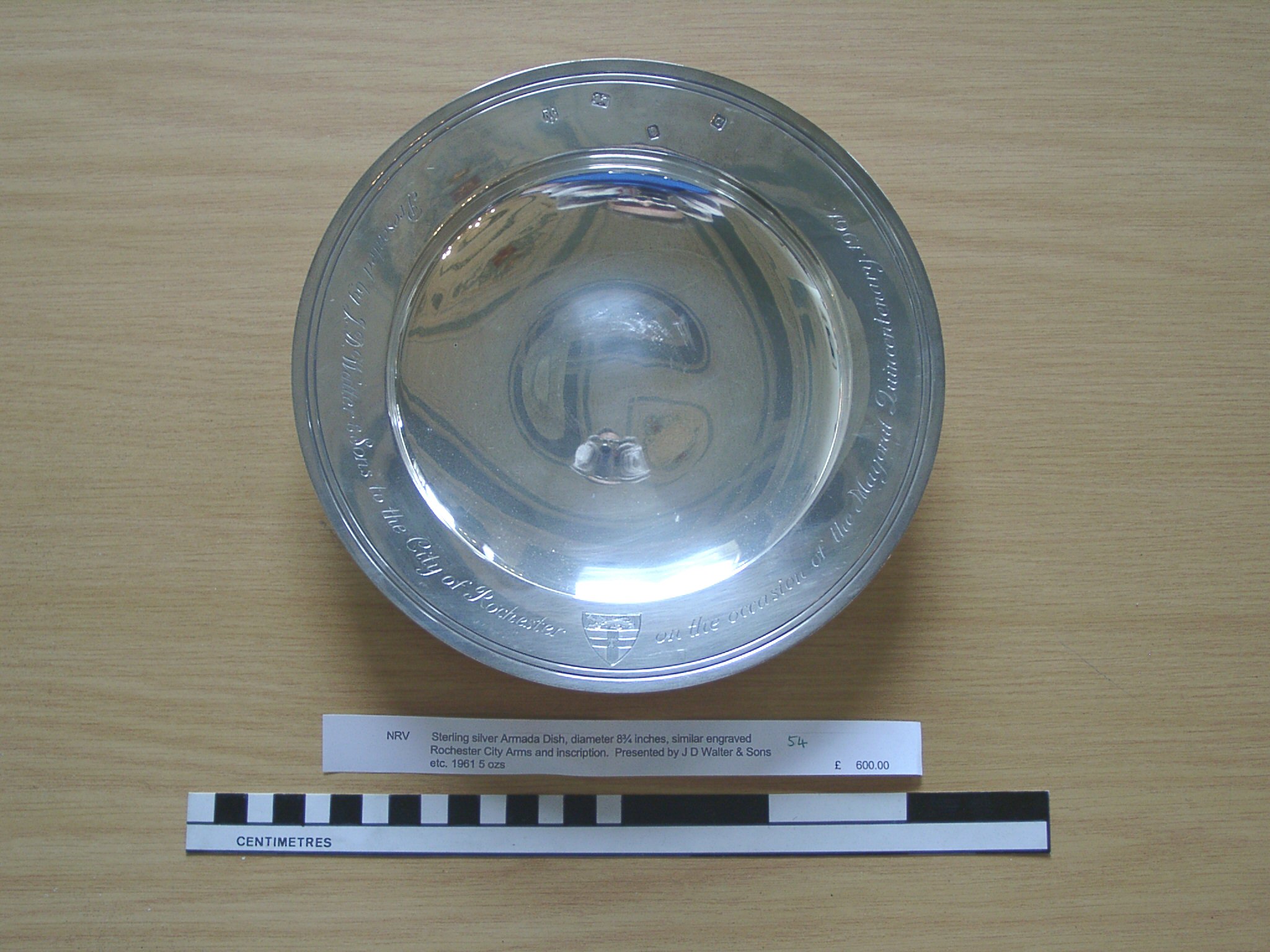 - DescriptionSterling silver armada dish; presented by J D Walter & Son to commemorate the Rochester Mayoral quincentenary in 1961; engraved with the City arms. 5ozs.