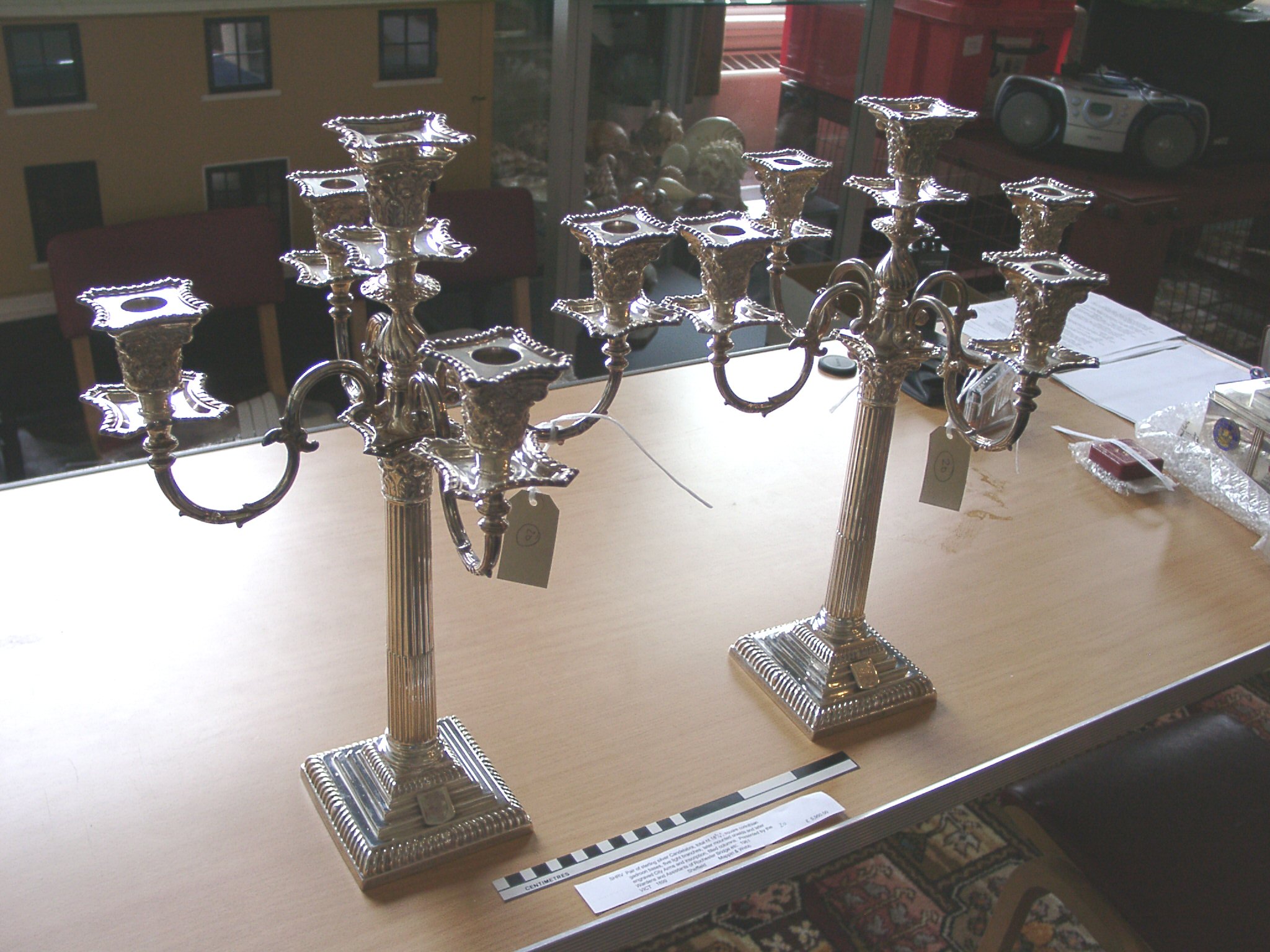 - DescriptionSterling silver candelabrum (one of a pair); presented by the Wardens & assistants of Rochester Bridge; square corinthinian gadroon bases, five light branches; later mounted shields with City arms of Rochester.