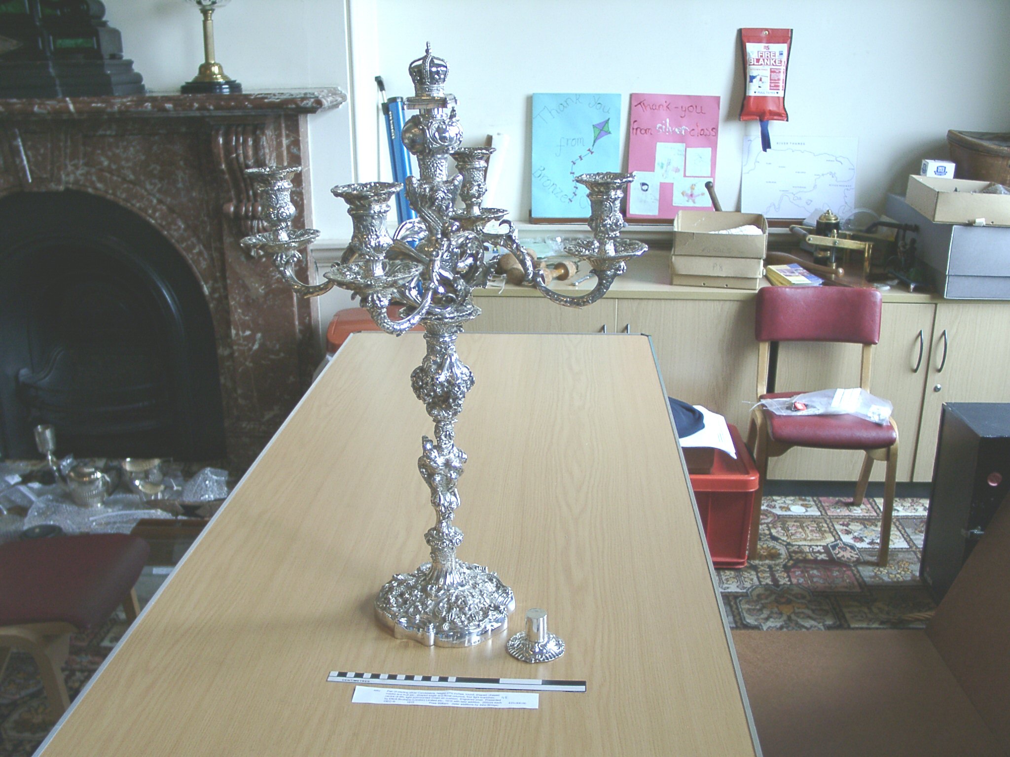 - DescriptionSterling silver candelabrum (one of a pair); presented by Elliott Brothers (London) Ltd; overall very elaborate chased floral, masks, fruit, lion's heads & eagles; 5 light branches, central 1 has an alternative fitting with crown on cushion design. 250 ozs.