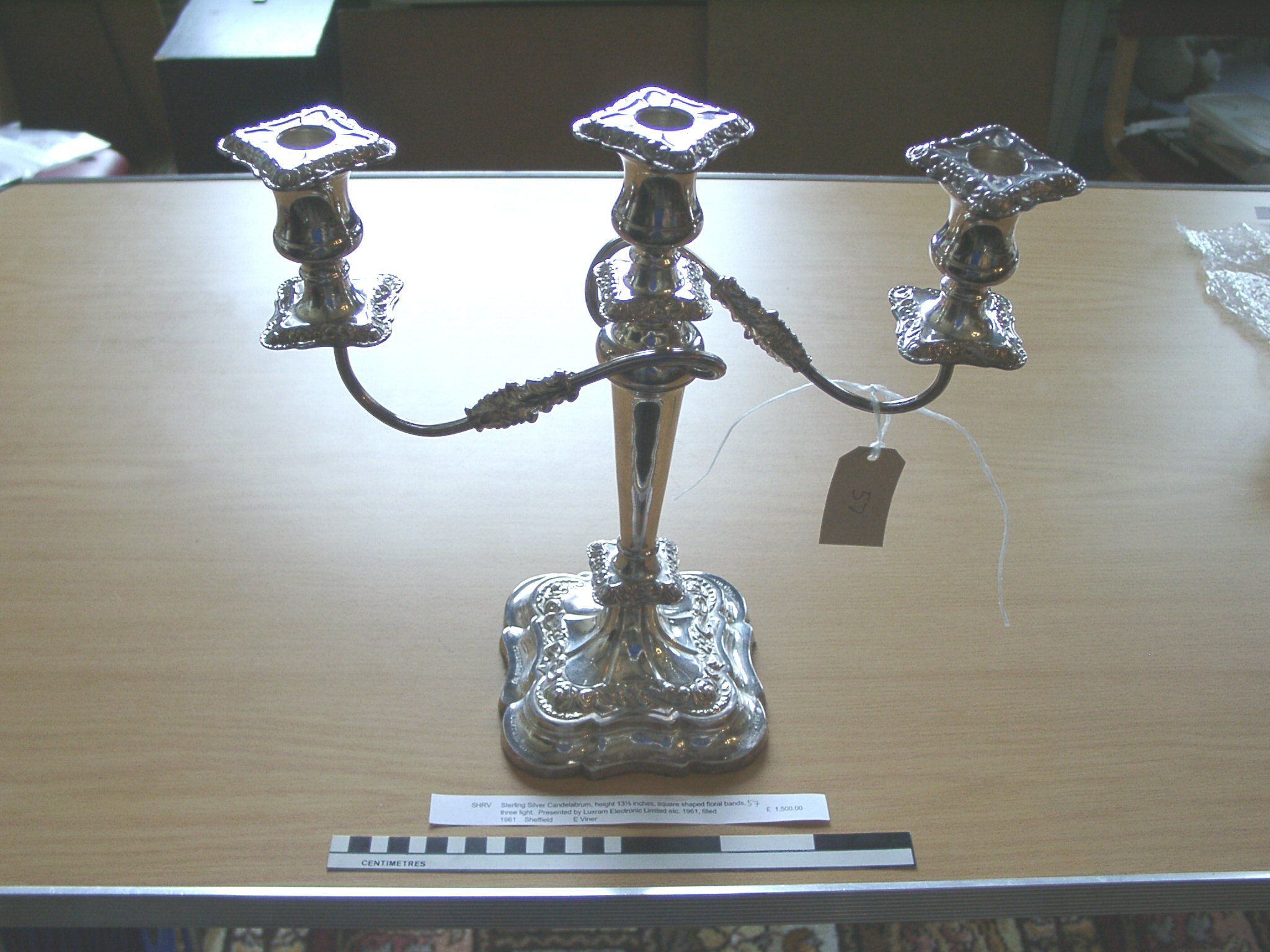 - DescriptionSterling silver candelabrum; presented by Luxram Electric Ltd in 1961; 3 light candelabrum, square shaped floral bands.