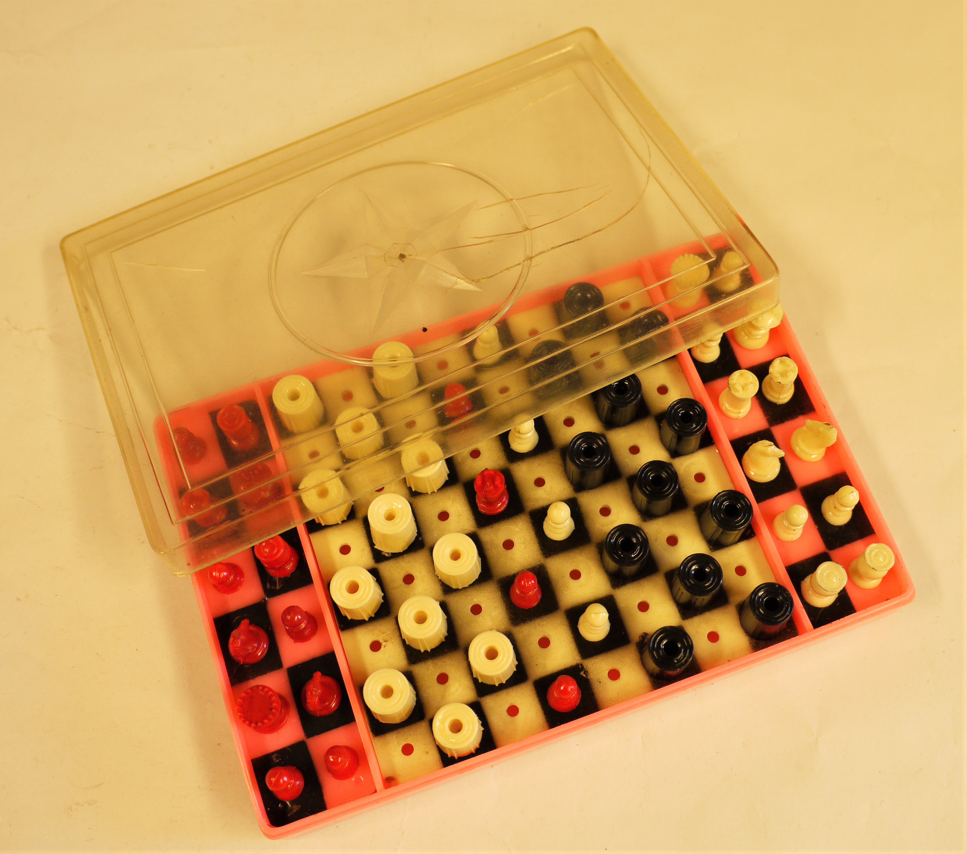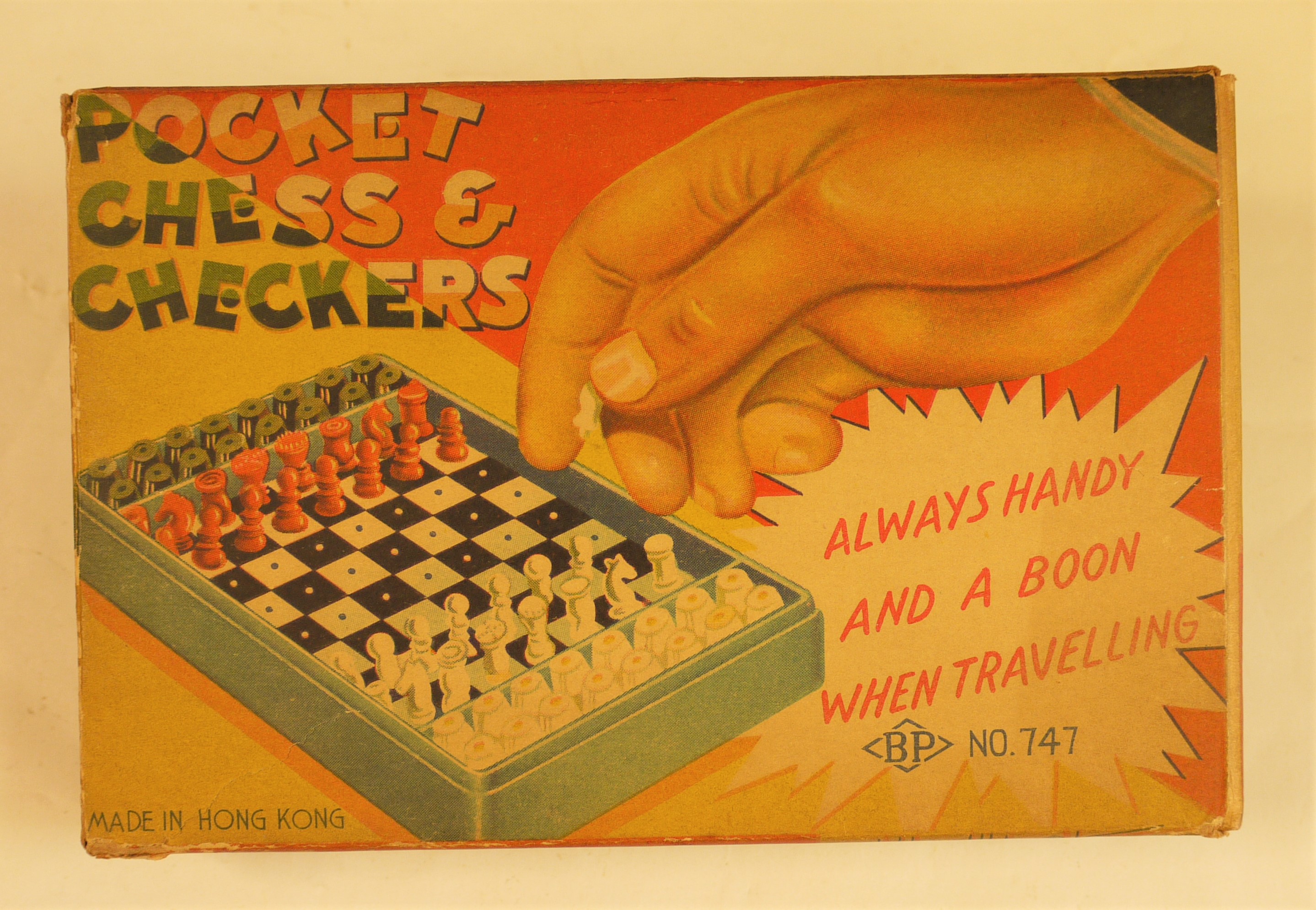 - DescriptionBoxed game; 'Pocket Chess & Checkers'; plastic chess & checkers pieces slot into plastic base with lid; coloured cardboard outer box.