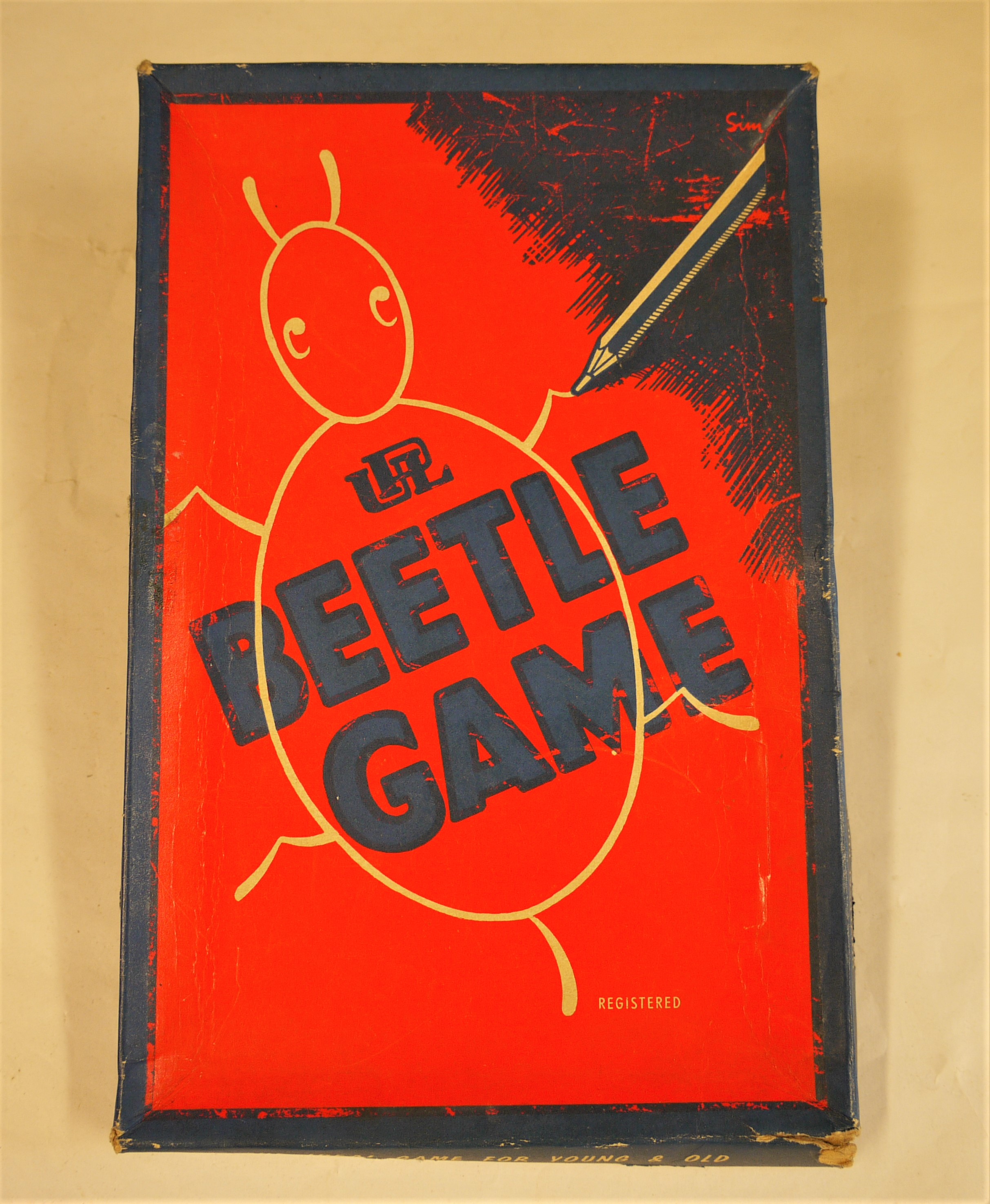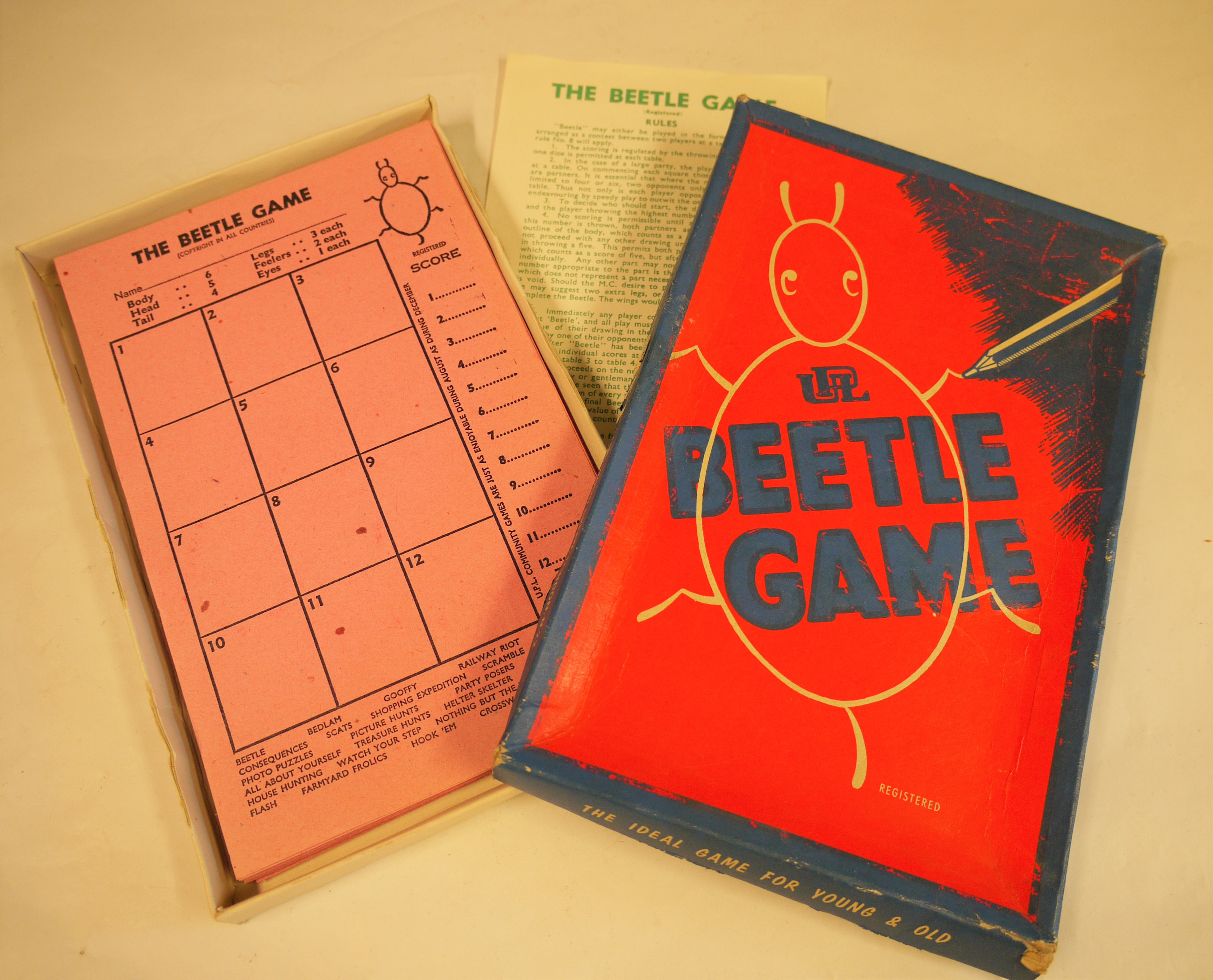 - DescriptionBoxed game; 'The Beetle Game'; printed instructions & pink scorecards.