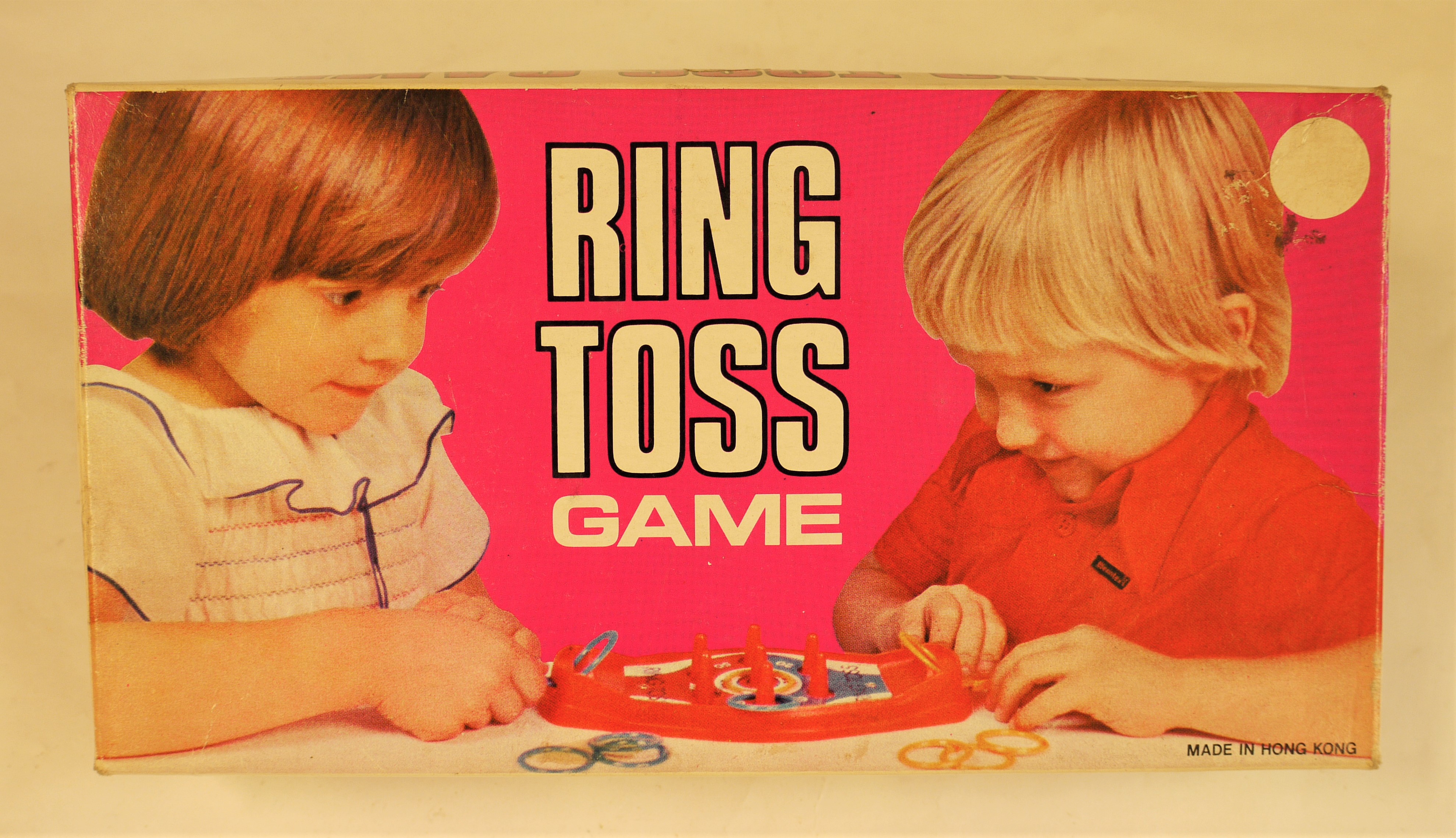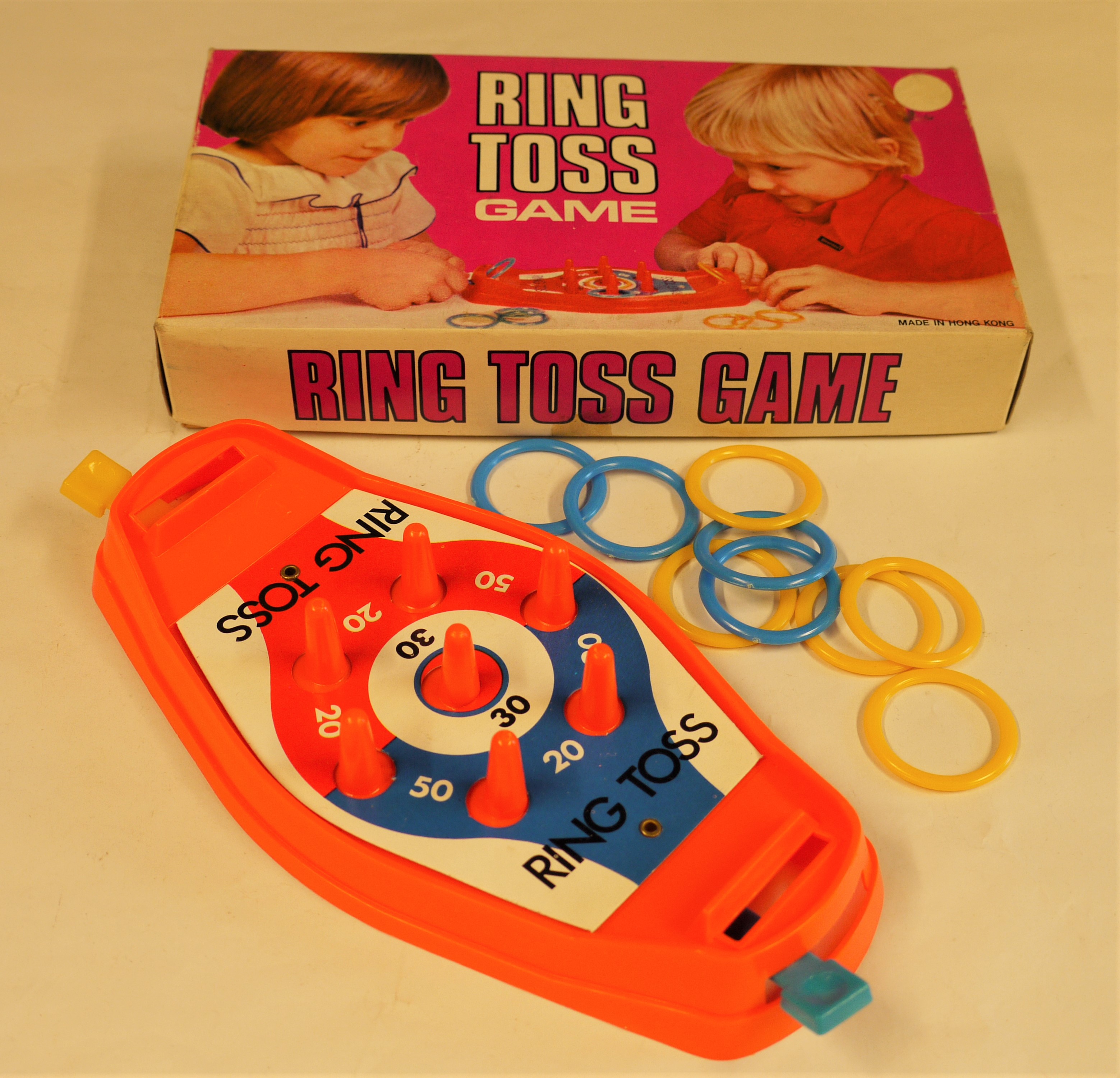 - DescriptionBoxed game; 'Ring Toss Game'; printed instructions on box lid & coloured plastic rings & game base (miniature hoopla game).
