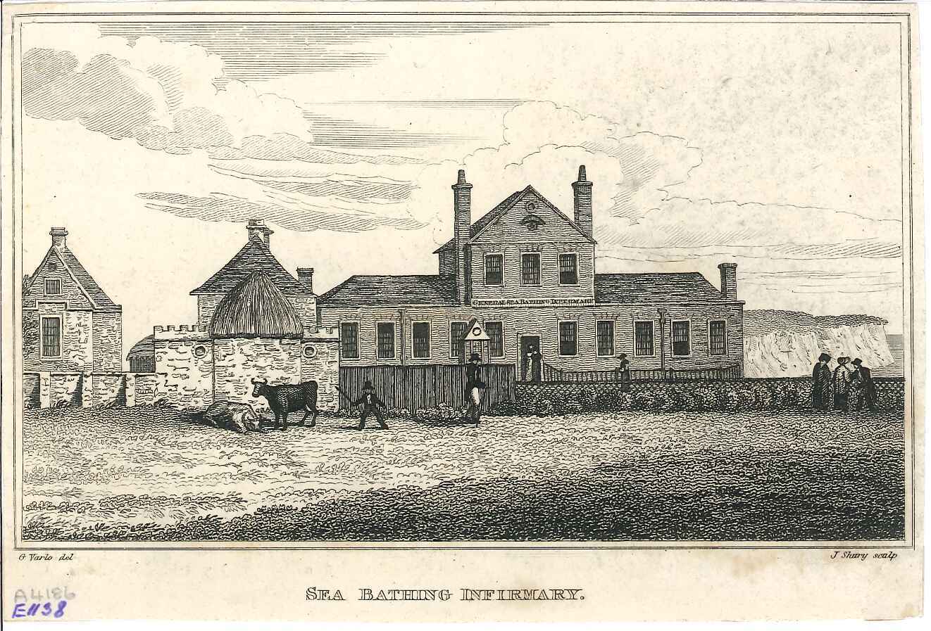 - Descriptionengraving of a view of Infirmary building (Margate) with field in front with herdsman and 2 cows, people looking over fence