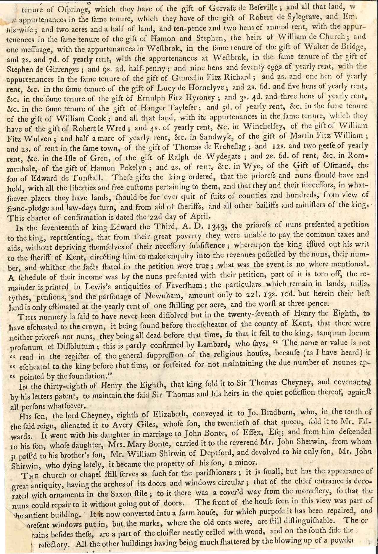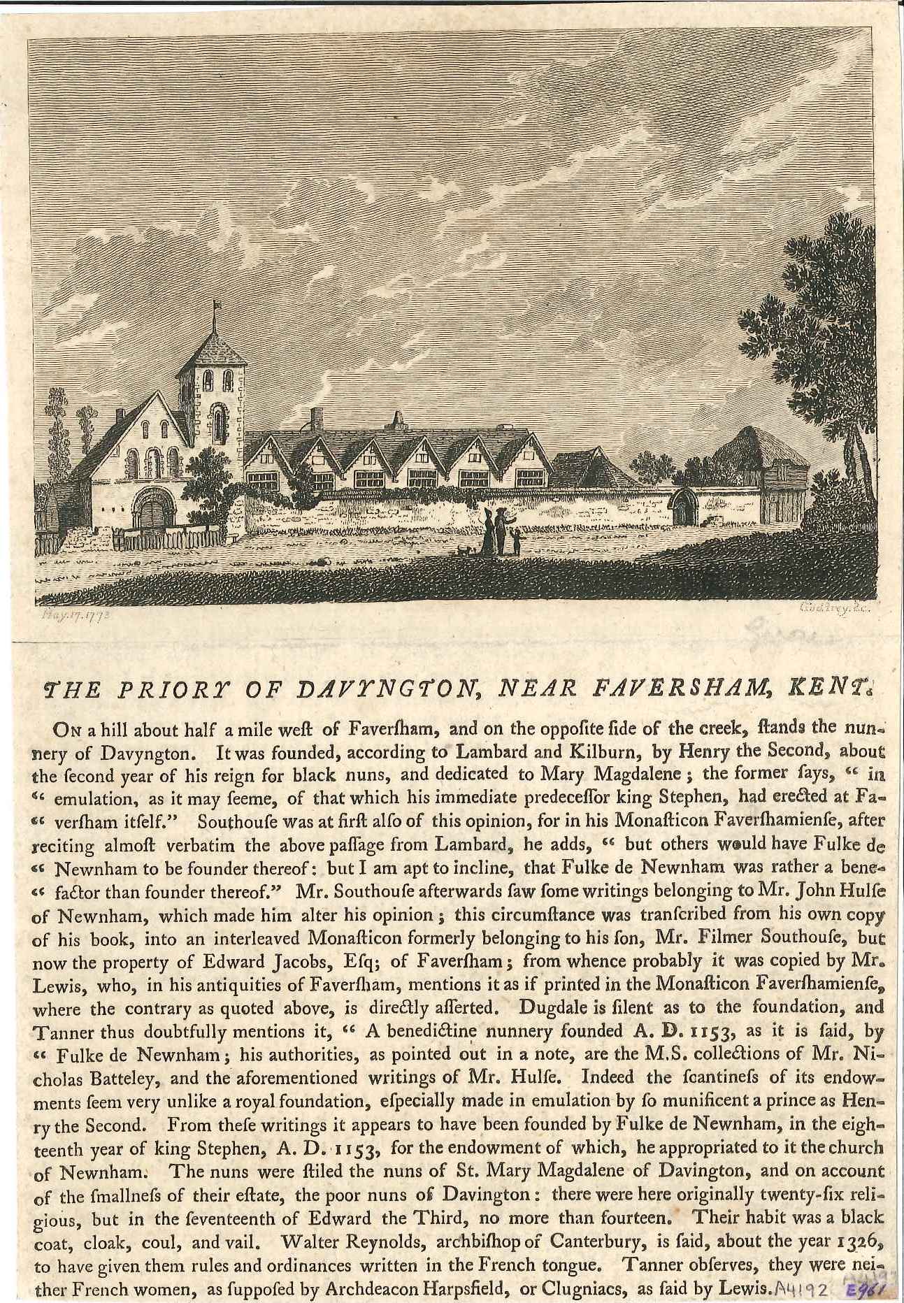 - DescriptionEngraving and historical text of the priory of Davyngton (Davington) near Faversham; taken from a volume of 'The Antiquities of England & Wales' by Francis Grose, text on reverse (see second attached image).
