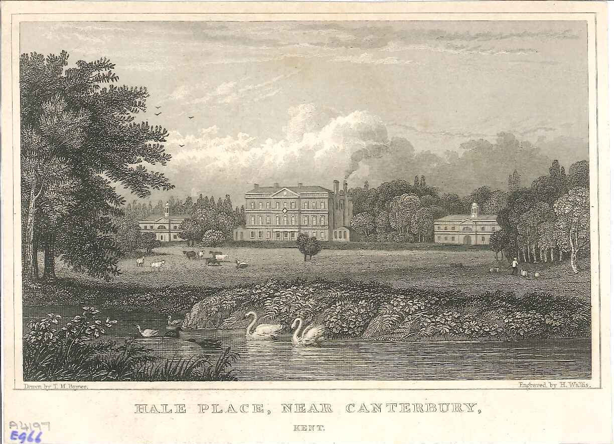 - DescriptionPrint of view of Hale Place, near Canterbury; large stately home seen across parkland with sheep & cattle; swans on a lake in the foreground. Originally produced for the "England's Topographer" series of Kent views (London 1828-1831).