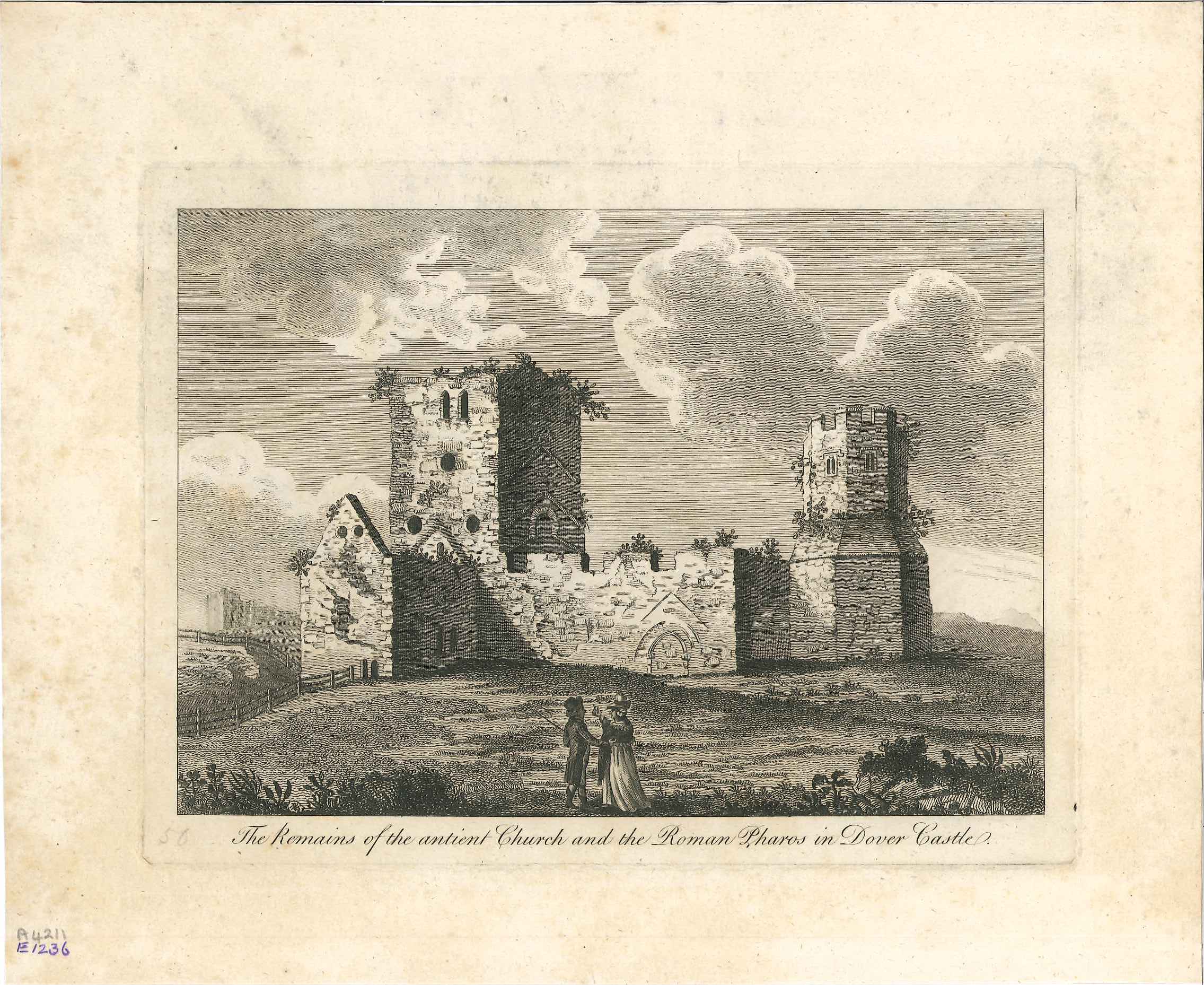 - DescriptionEngraving of the remains of ancient church and Roman pharos in Dover Castle; taken from 'The History of Kent' by John Harris.