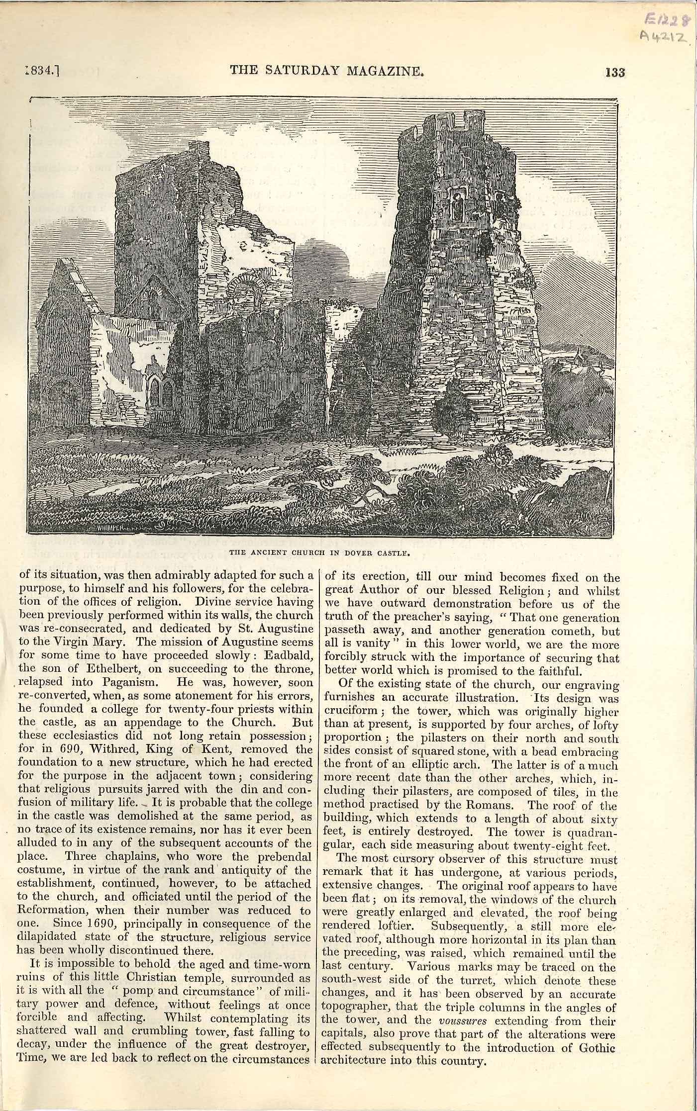 - DescriptionEngraving of Dover Castle church & Roman pharos; published with text in 'The Saturday Magazine' in 1834. See image attached to record A4213 for the rest of the text.