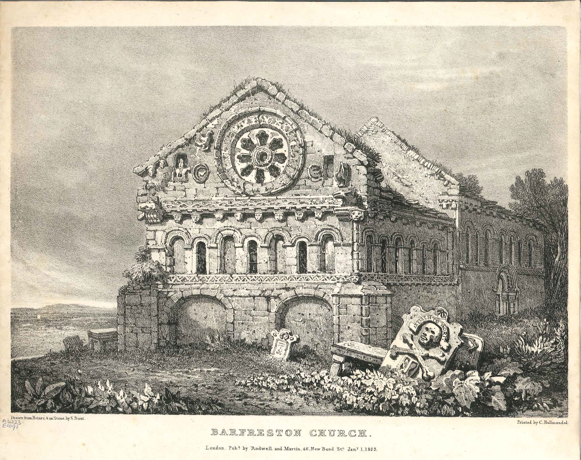 Engraving of the ruins of Barfreston Church, northwest of Dover.