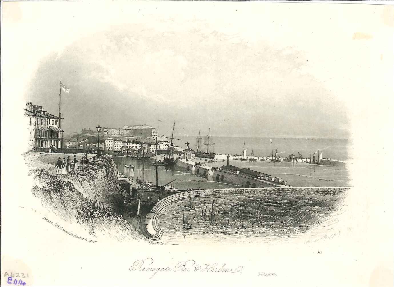 engraving of the Pier & Harbour at Ramsgate taken from the top of the cliff looking down