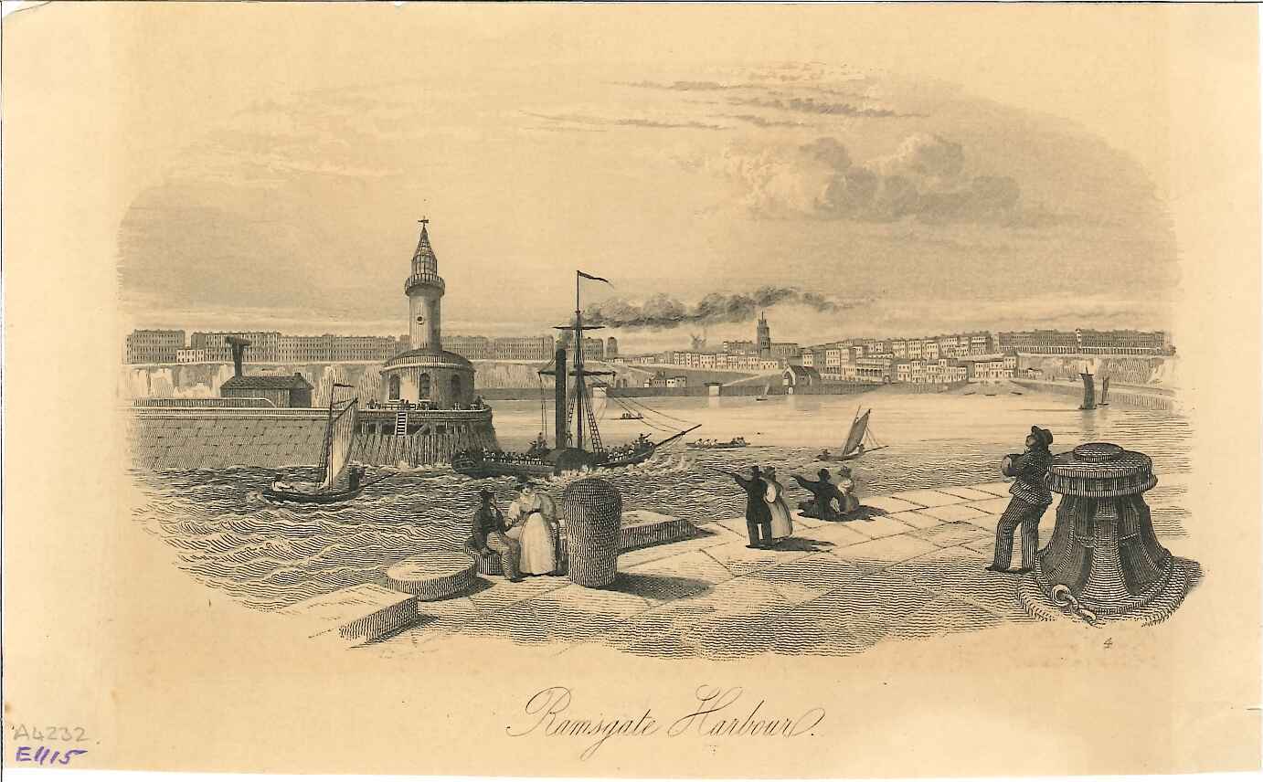 engraving of the Harbour at Ramsgate with public stood around looking at paddle steamer leaving harbour.