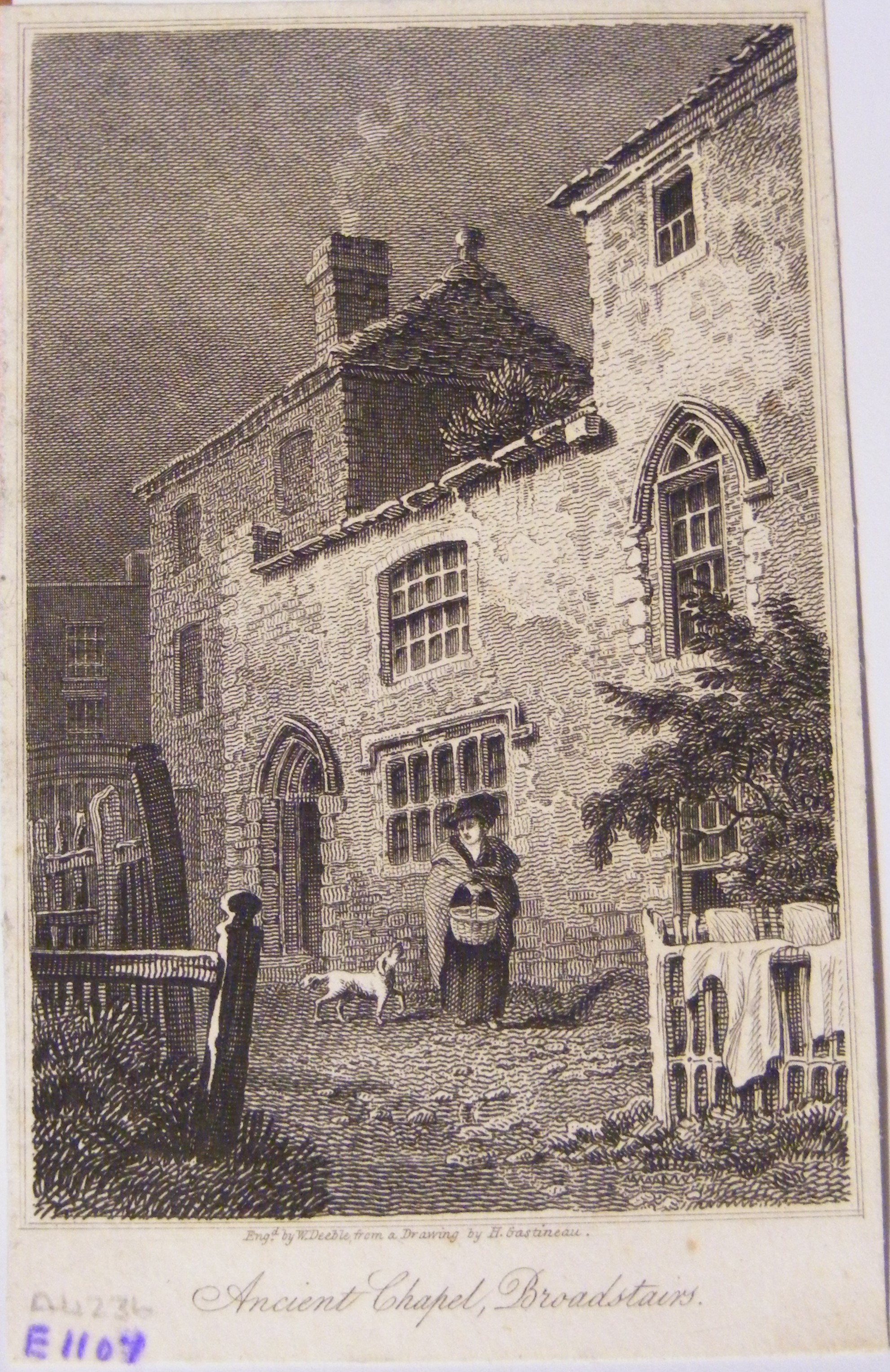 - Descriptionengraving of St Mary's chapel in Broadstairs; with a lady in front with a basket and dog following, also clothes drying on a fence adjoining; this is the 'Shrine of Our Ladye Star of the Sea in Bradstowe' (now Broadstairs)