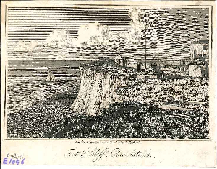 - DescriptionEngraving of the Fort & Cliffs at Broadstairs; taken from 'THE BEAUTIES OF THE ISLE OF THANET AND THE CINQUE PORTS, LONDON PUBLISHED BY W. MARSHALL, 1 HOLBORN BARS'.