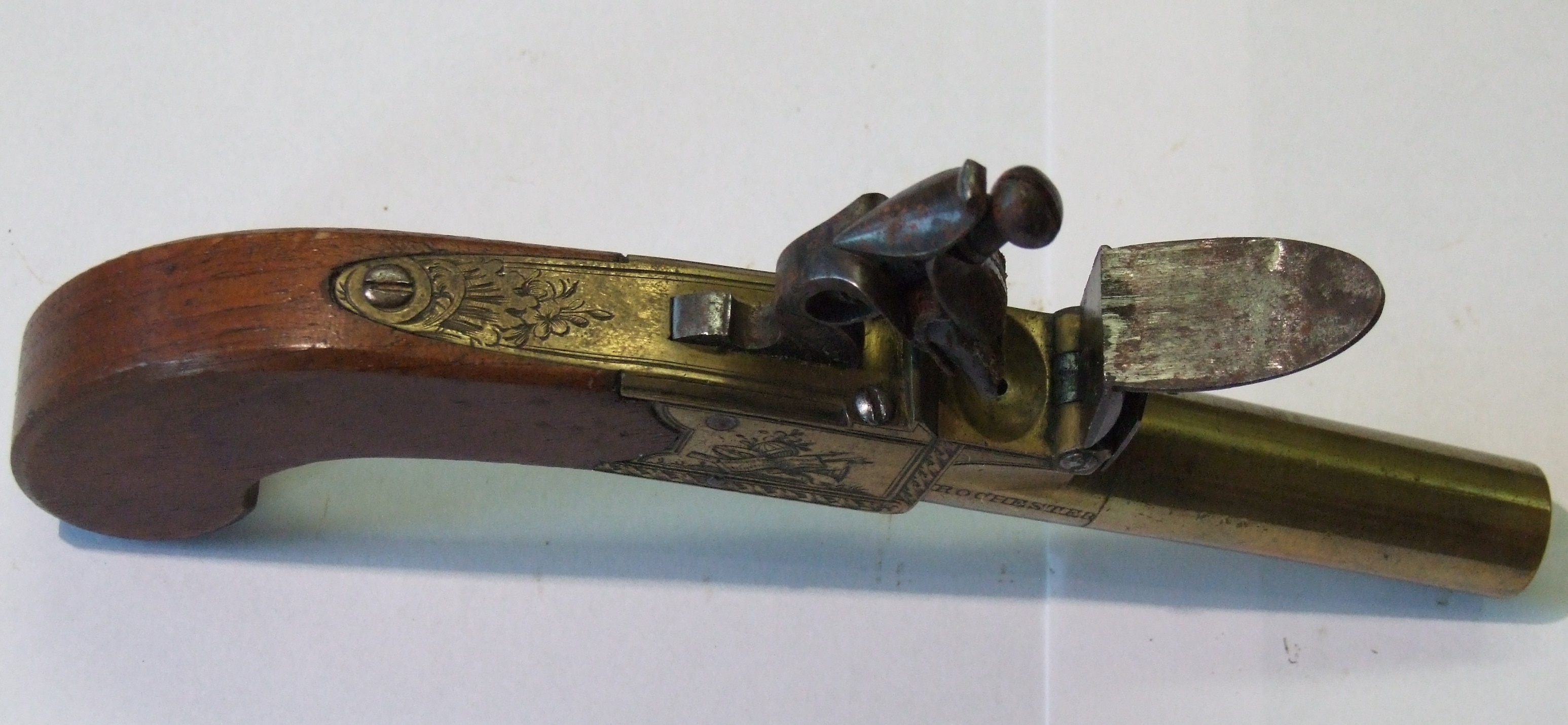 - DescriptionFlintlock pocket pistol; screw off barrel; made by Palmer of Rochester; high quality item; one of a pair with A1323; decoration of trophy of arms.