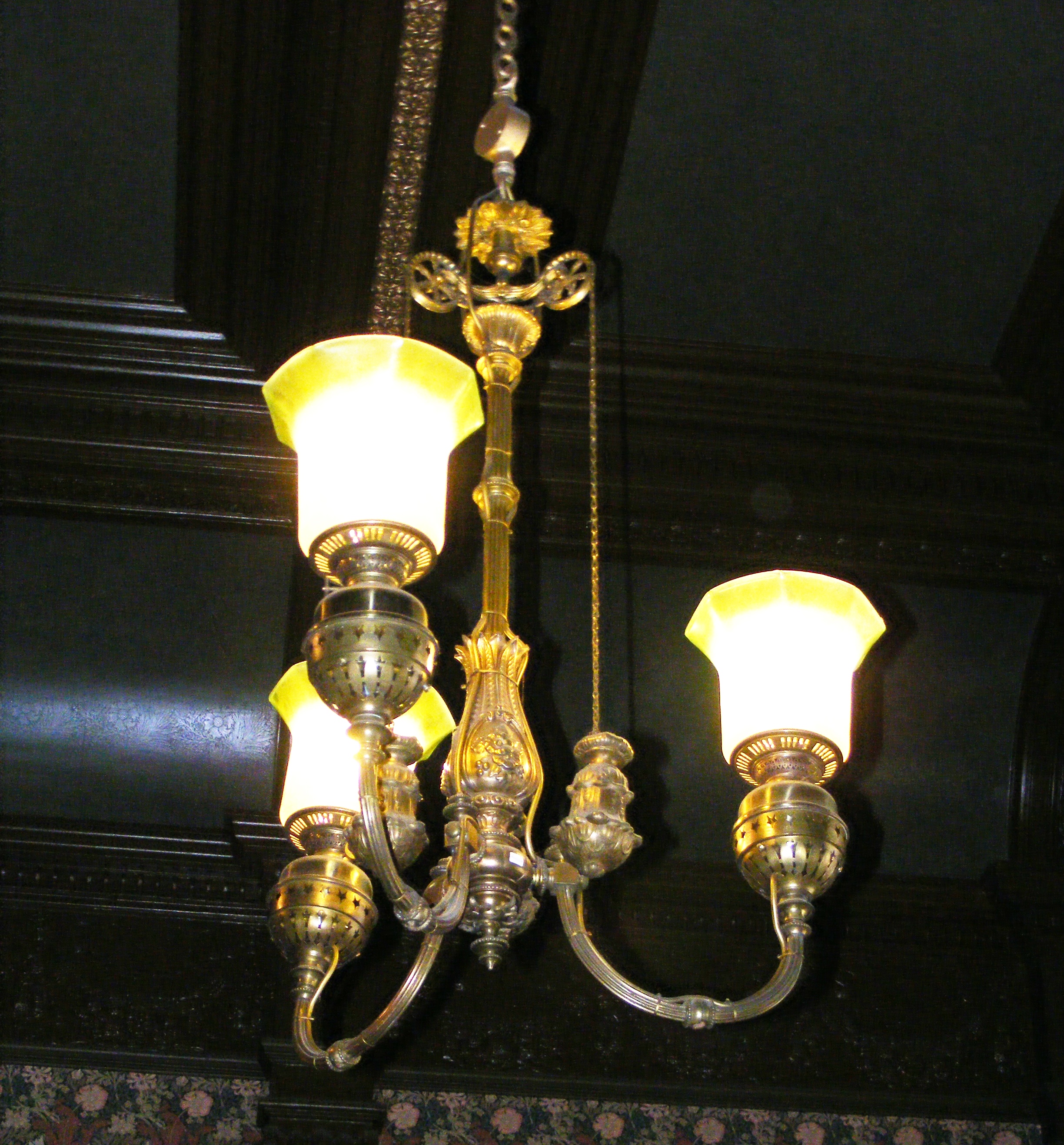 - DescriptionThree lamp cast and wrought brass (copper alloy) chandelier; spun brass founts with 'Mikardo' paraffin burners; fitted with ornate balance weights; 3 matching glass lampshades, opaque glass with etched flowers; tops octagonal fluted, with green colour. Suspended from ceiling of the Boardroom of the Conservancy wing.