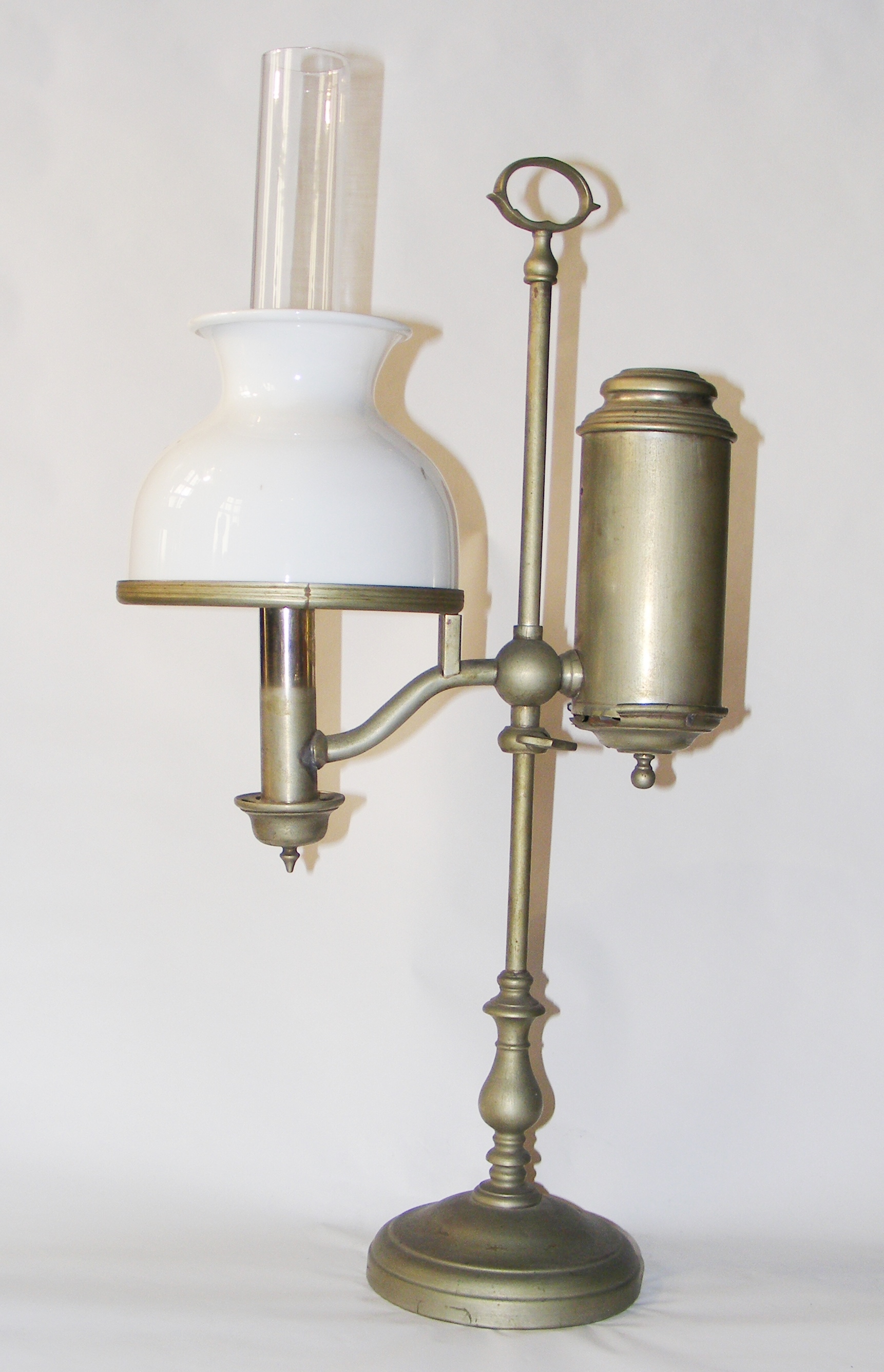 - DescriptionOil lamp, freestanding; brass round base & narrow shaft; supports a cylindrical brass oil reservoir (cracked base) & brass burner; clear glass chimney; opaque domed white glass shade; height of lamp can be adjusted. Designed to burn Colza oil.