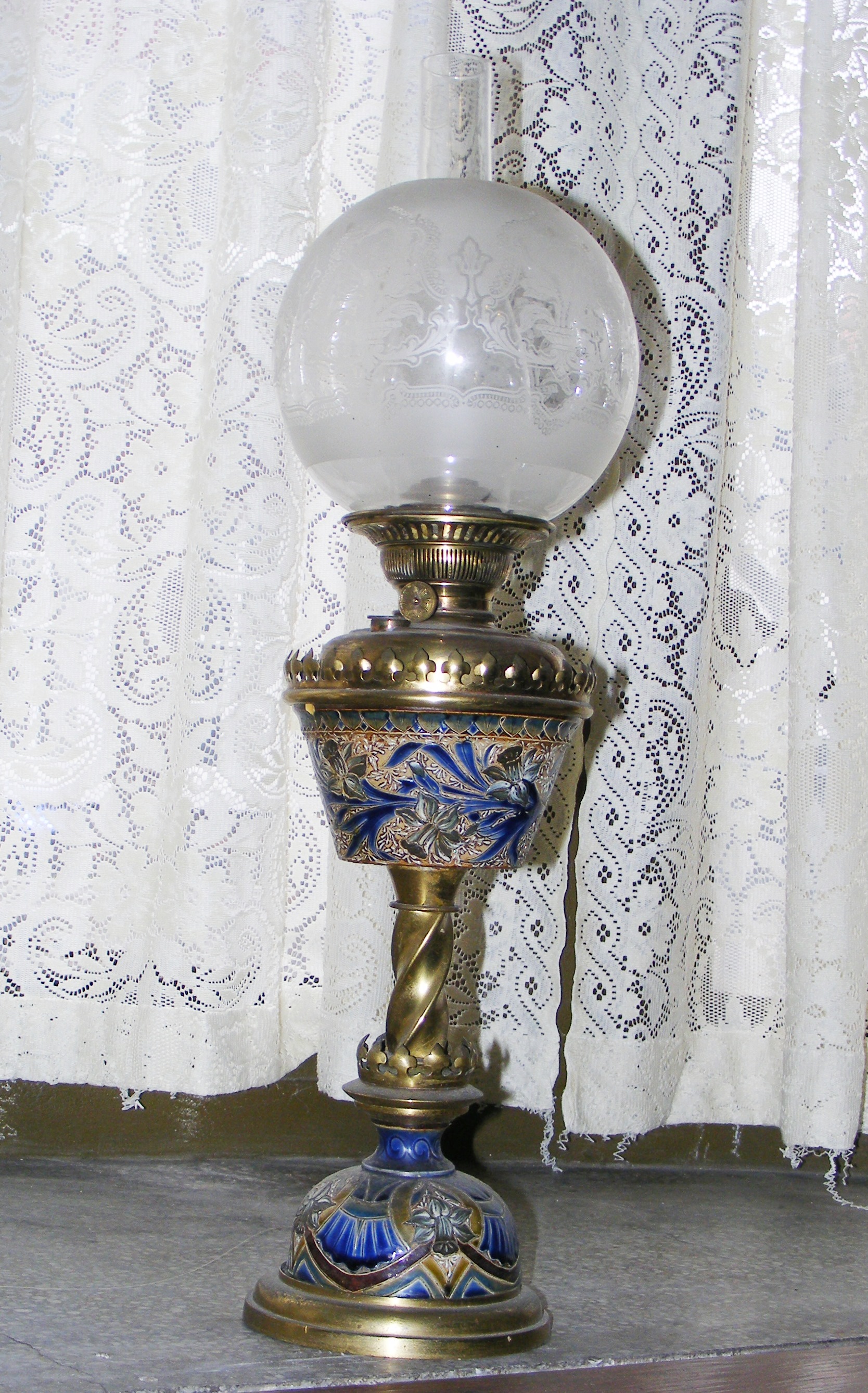 - DescriptionOil lamp, freestanding; copper alloy base; ceramic body (Royal Doulton green, grey & blue daffofils & leaves design); matador burner; clear glass chimney; opaque glass shade with etched floral design. Marks on ceramic: 'EDL 215' (Edith D Lupton 1876-90)?; 'pp' (Pennett Helena M.)?; 'gg' (Mary A Goode 1882)?