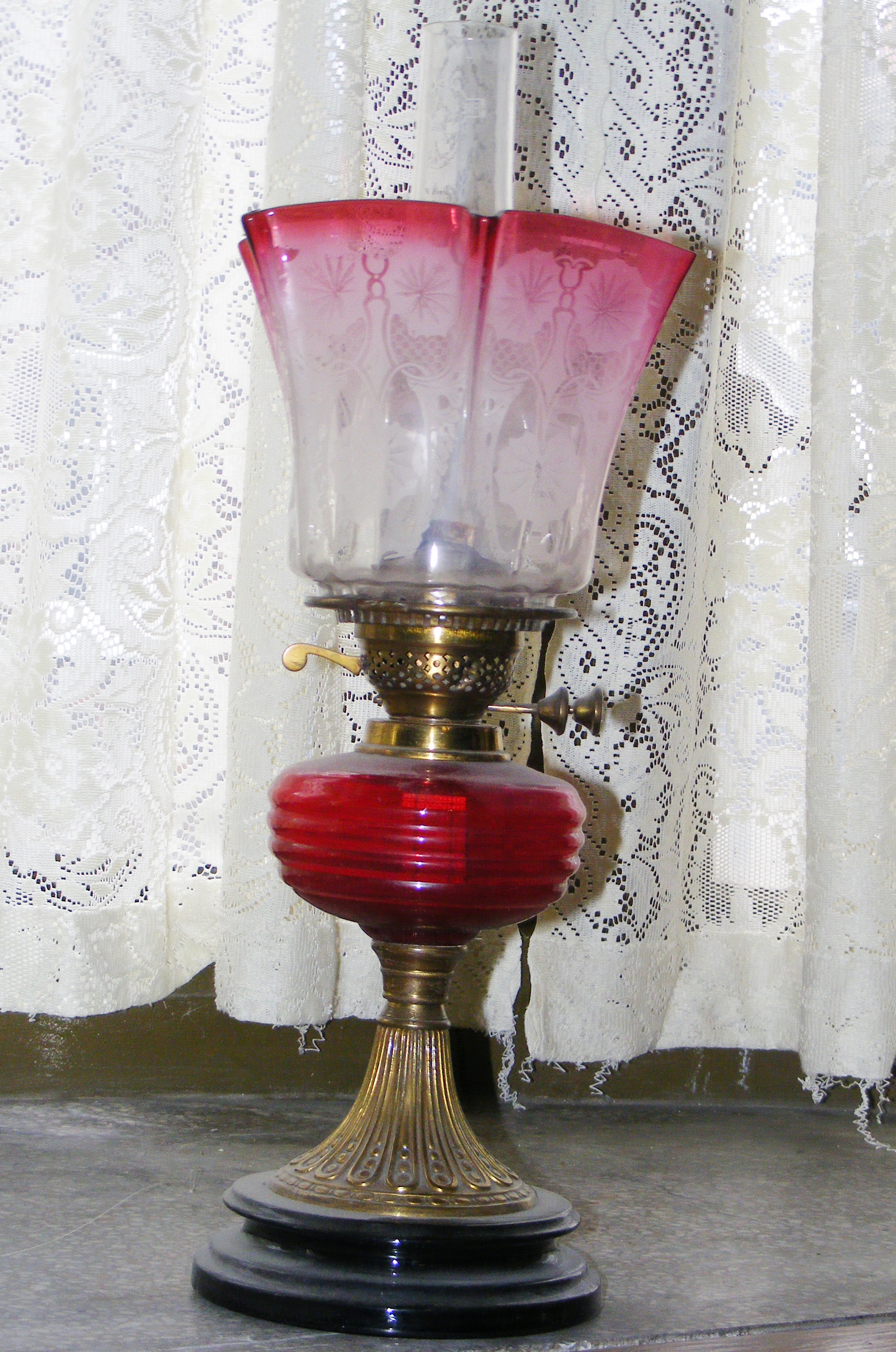 - DescriptionOil lamp, freestanding; copper alloy base; red glass reservoir; brass burner; clear glass chimney; flared glass shade with partial red colour with etched floral design. Not sure if the Norris78 number reference is just for the shade or the whole lamp.