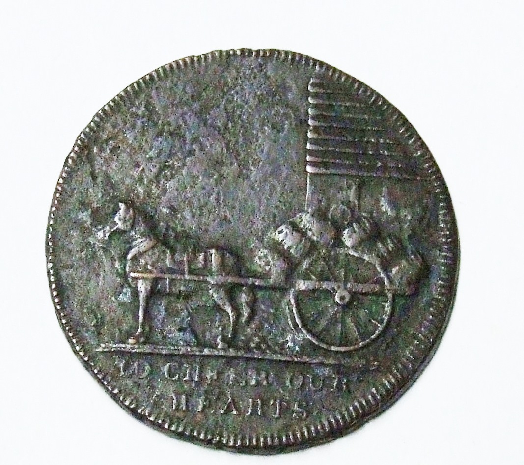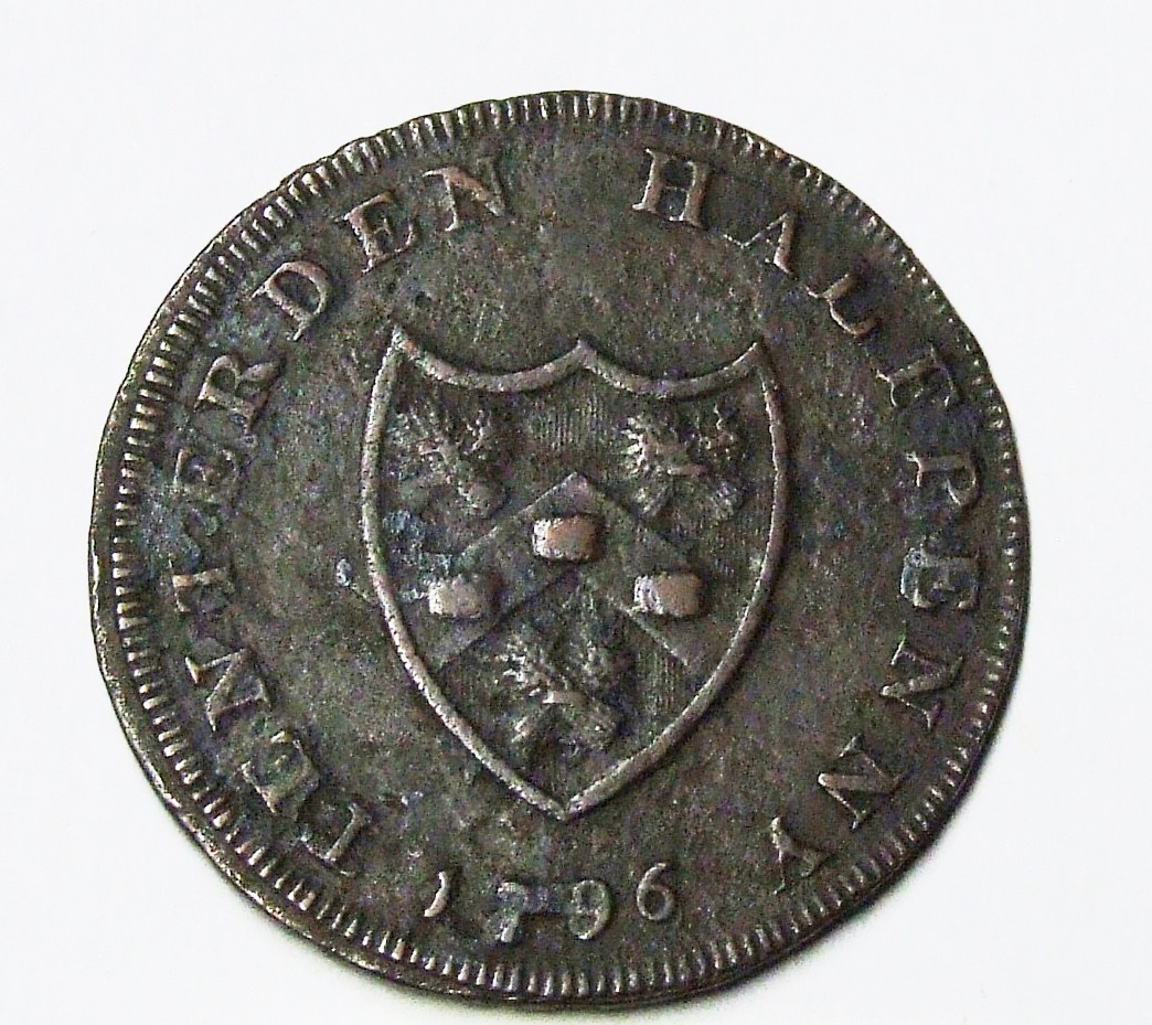 - DescriptionHalfpenny token, Tenterden halfpenny token; circulated in Kent & southern England; obv: arms of the Brewers Co; Rev: image of a horse & dray with part of a brewhouse. A little battered, but fully legible. Token issued due to acute shortage of copper currency during reign of George III.