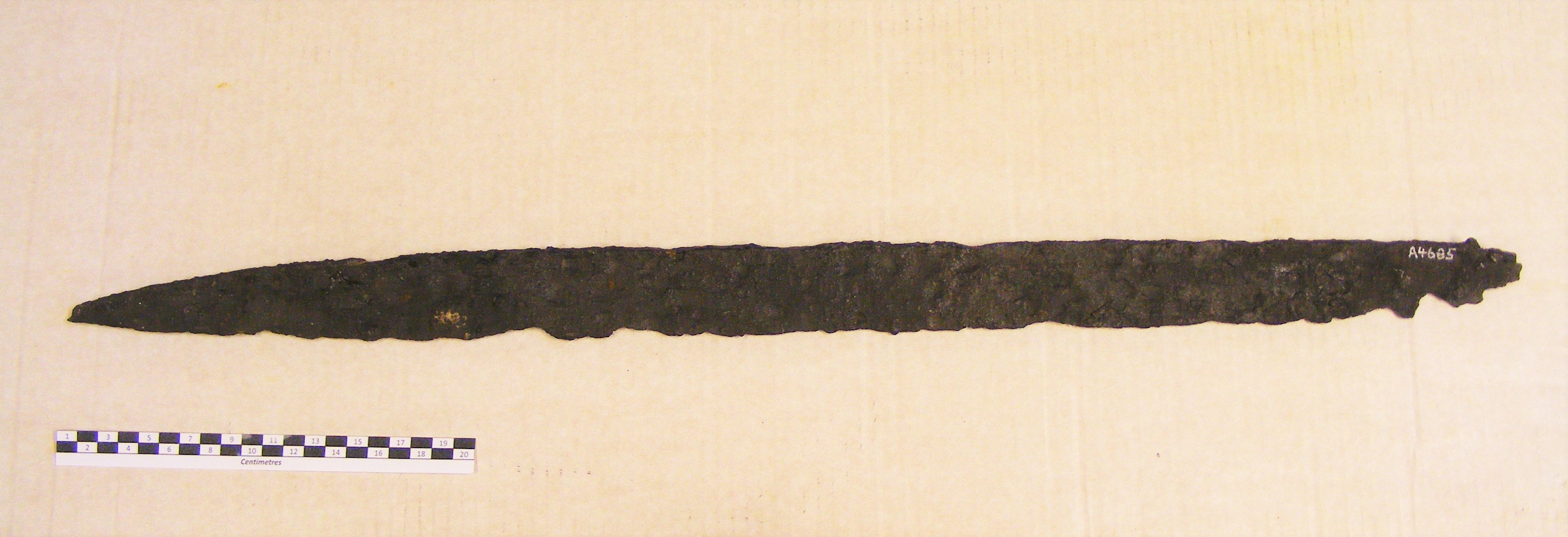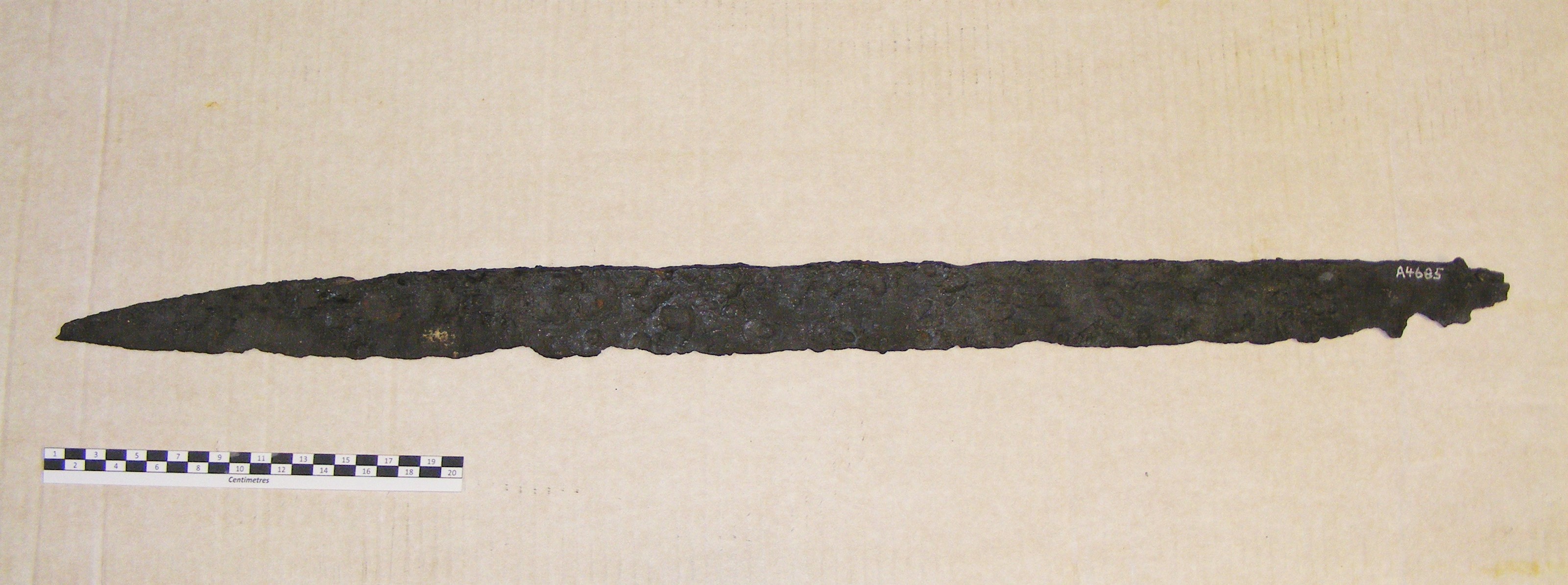 - Descriptionsword blade (scramasax); long single-edged blade; thick blunt, almost straight top edge; stump of tang; slender point. Possibly one of the items donated by S J Whawell in 1912. Listed with Anglo-Saxon objects (the unregistered 'X-number' series); no provenance, but probably Kent.