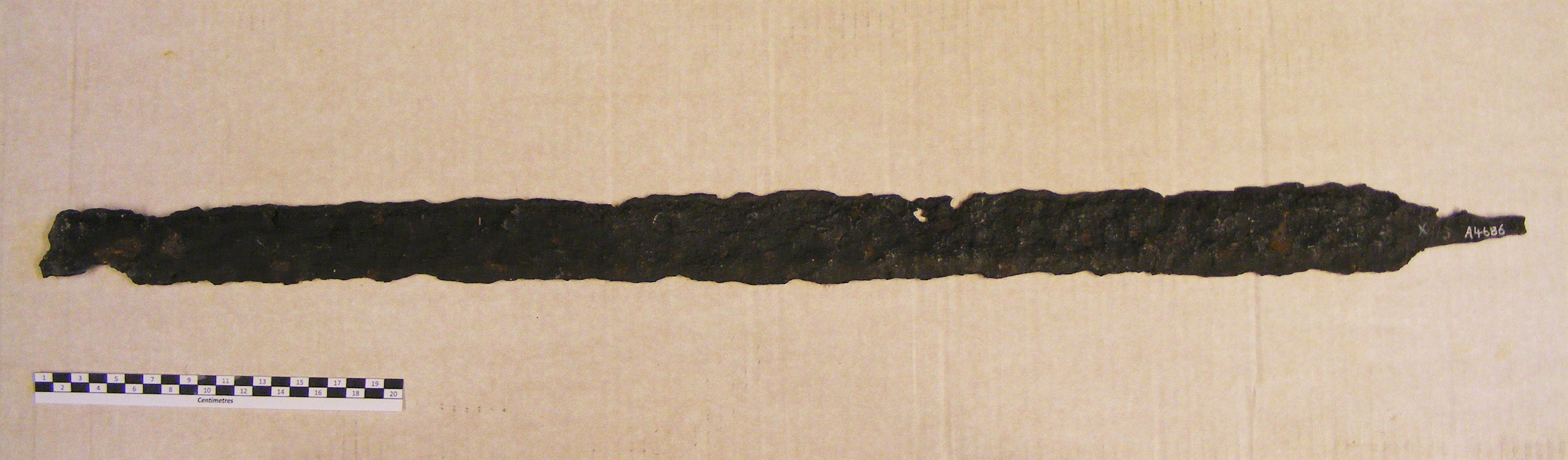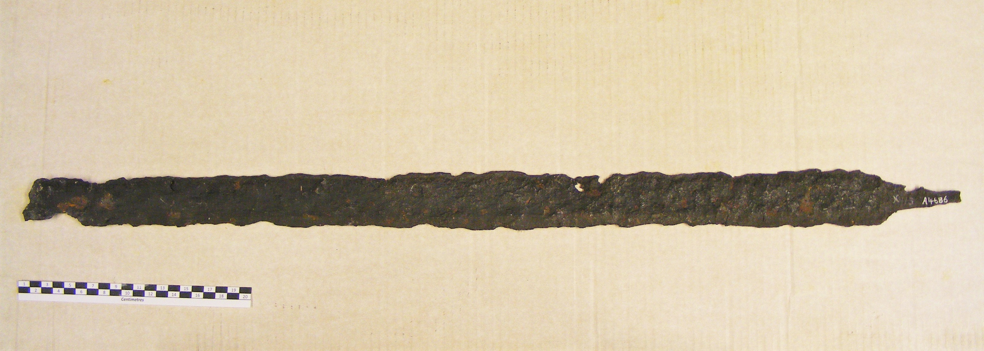- Descriptionsword blade, poor condition; thin, pitted & holed with corrosion; long double-edged blade, point is missing; short narrow tang. Possibly one of the swords from the Anglo-Saxon cemetery at Sarre, lent by the KAS pre-1905?