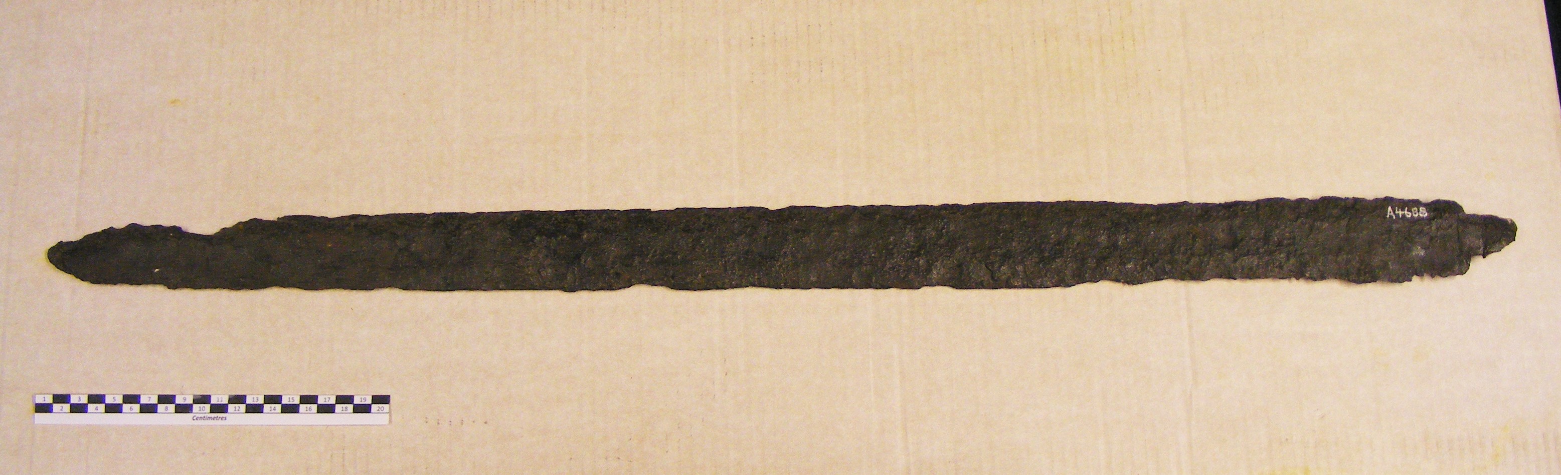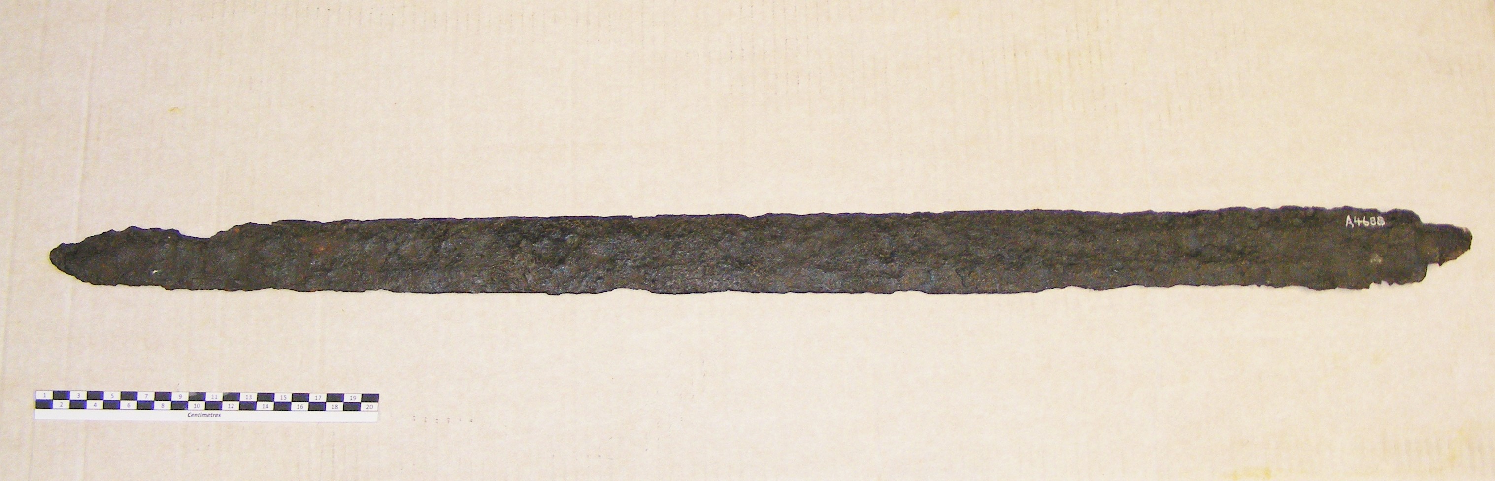 - Descriptionsword blade; long, quite broad double-edged blade; stump of tang, possibly showing impressions of wood or bone handle plates. Possibly one of the items donated by S J Whawell in 1912; no provenance, but probably Kent.