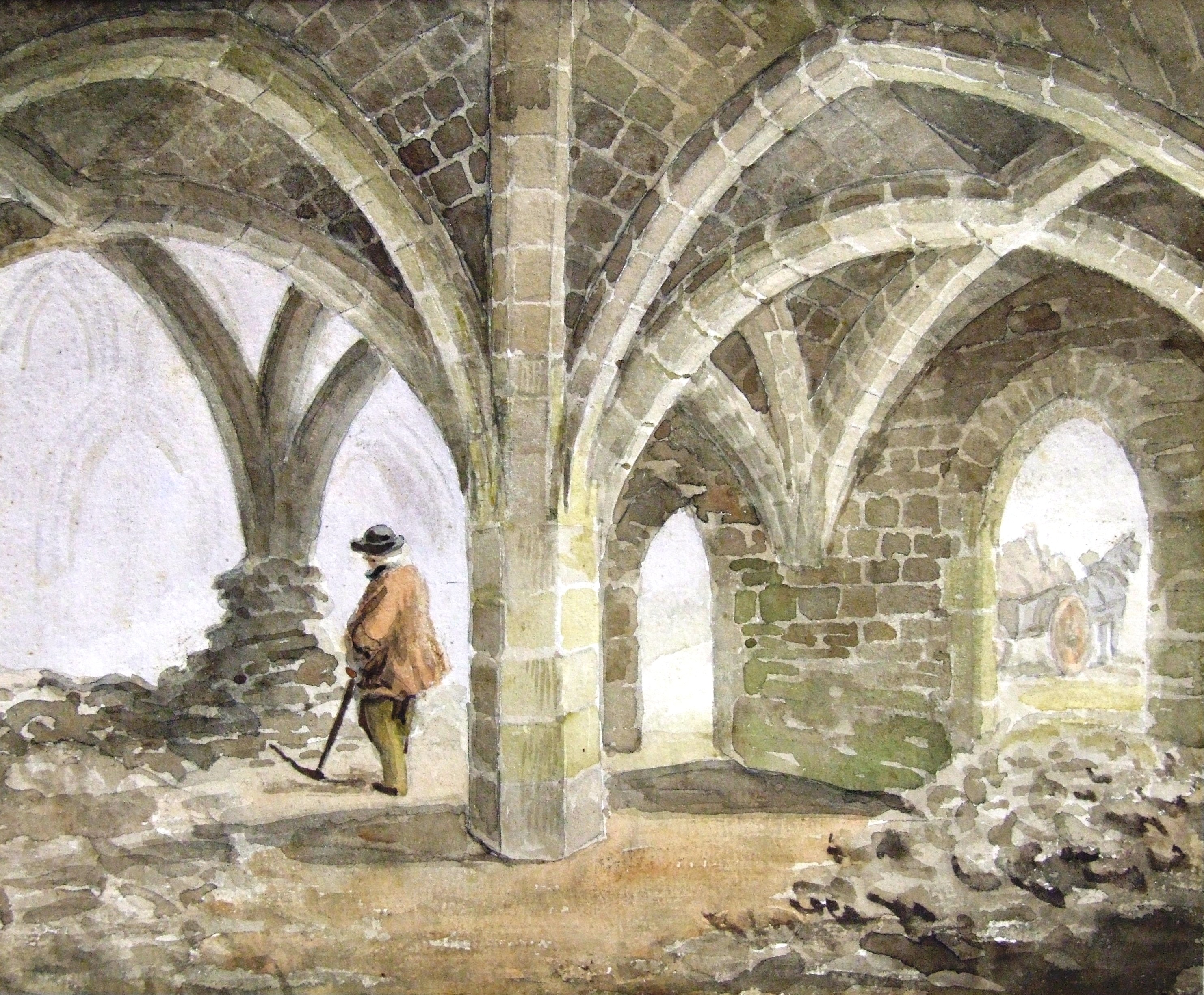 Watercolour painting of the old Crown Inn cellars, Rochester; shows elderly workman leaning on pick in the stone-built vaulted medieval cellars; cart in background; see also A4841, similar image. Donated some time before 1905? Stephen Aveling was a family member of the company who specialised in the manufacture of road rollers. He wrote articles for Archaeologia Cantiana in the 1880's.