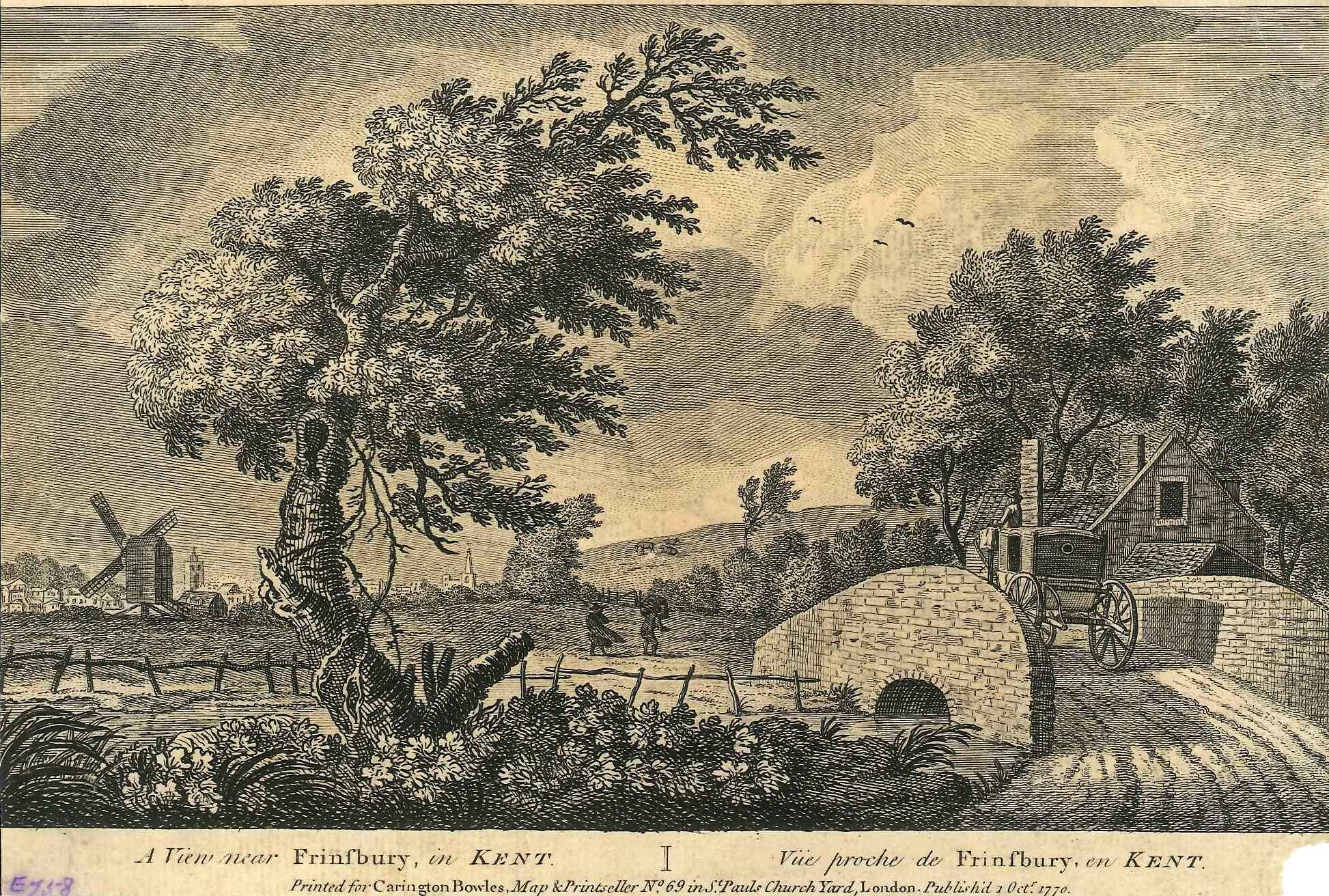 - DescriptionPrint of a view near Frindsbury in 1770; presumably removed from a book (titles in English & French); shows a coach crossing a small bridge over a stream, post windmill in the distance with church spires.