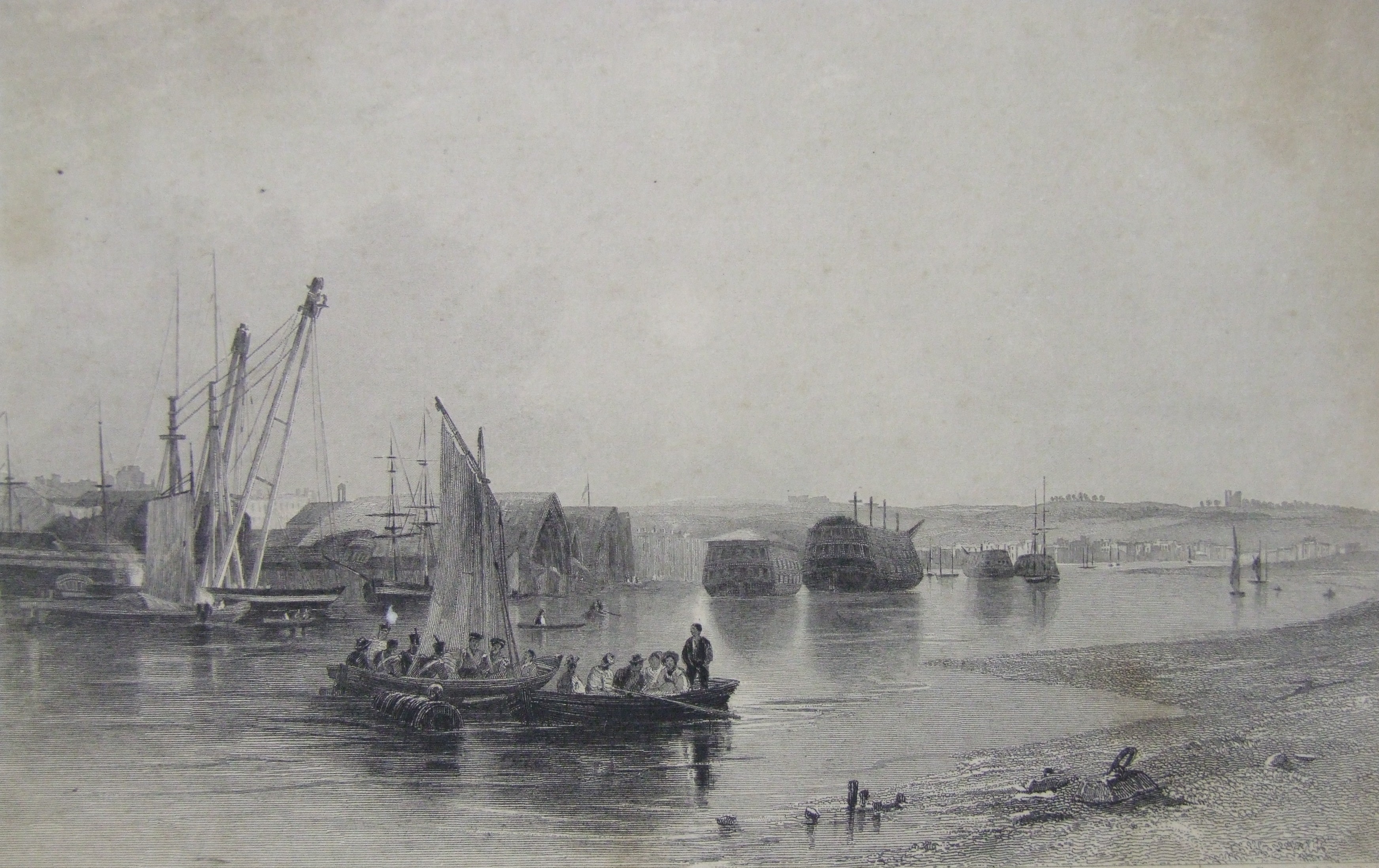 - DescriptionPrint of a view of the River Medway at Chatham; shows two rowing boats with sailors & civilians, various Navy vessels & sheds beyond.