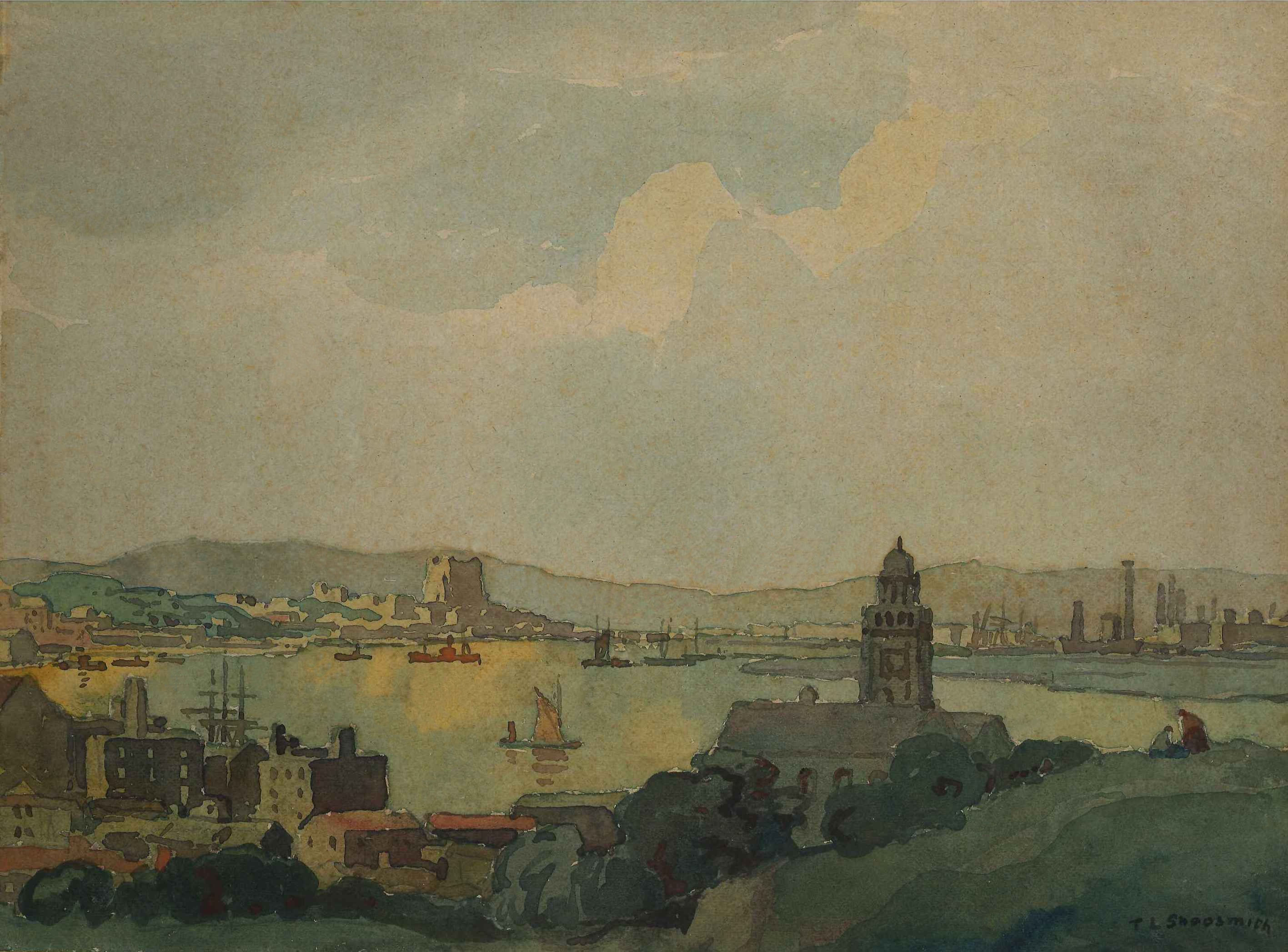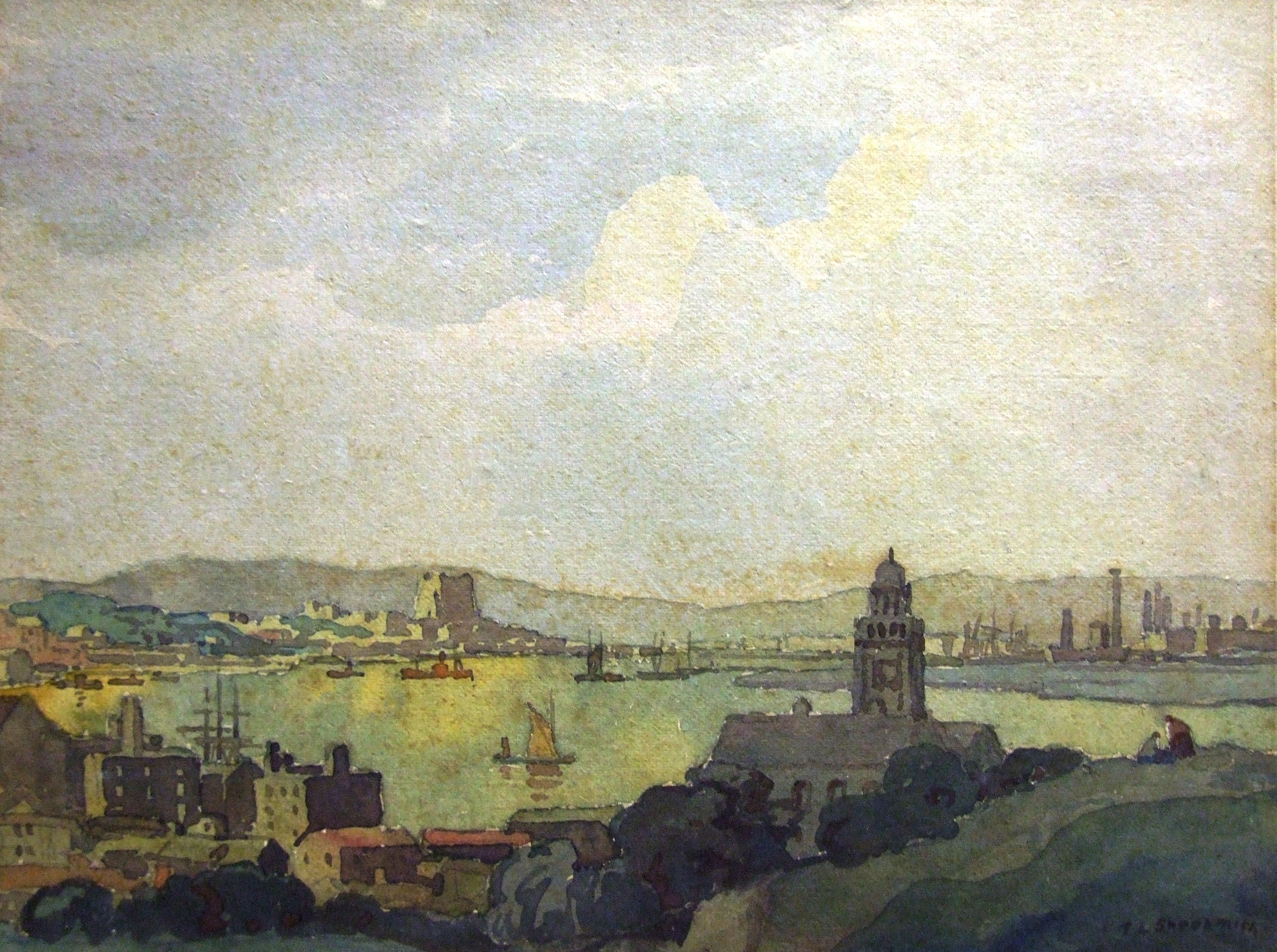 Watercolour painting from the Chatham Lines looking across Chatham towards Rochester; Chatham Town Hall is in the foreground, the river with barges, and Rochester Castle & Frindsbury cement works in the background; some foxing; unframed. Donated in 1924; the artist may be Thurston L Shoosmith, listed as a solicitor from Northamptonshire in the 1901 census.