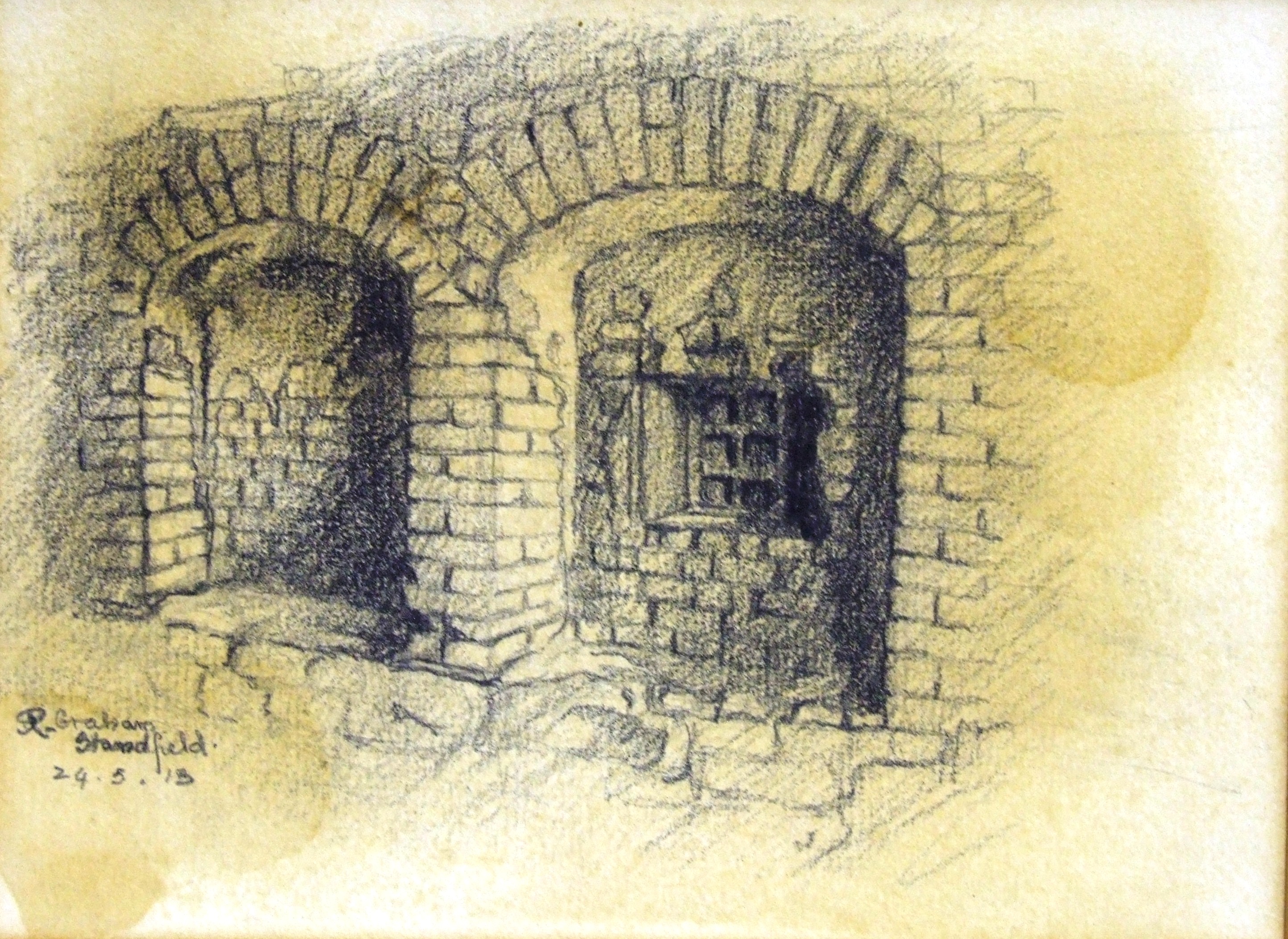 - DescriptionSmall pencil sketch; shows interior brickwork of delapidated porch & doors of Place House, All Hallows; unframed; some light staining. Mounted below A4852. Place House is now a caravan site.