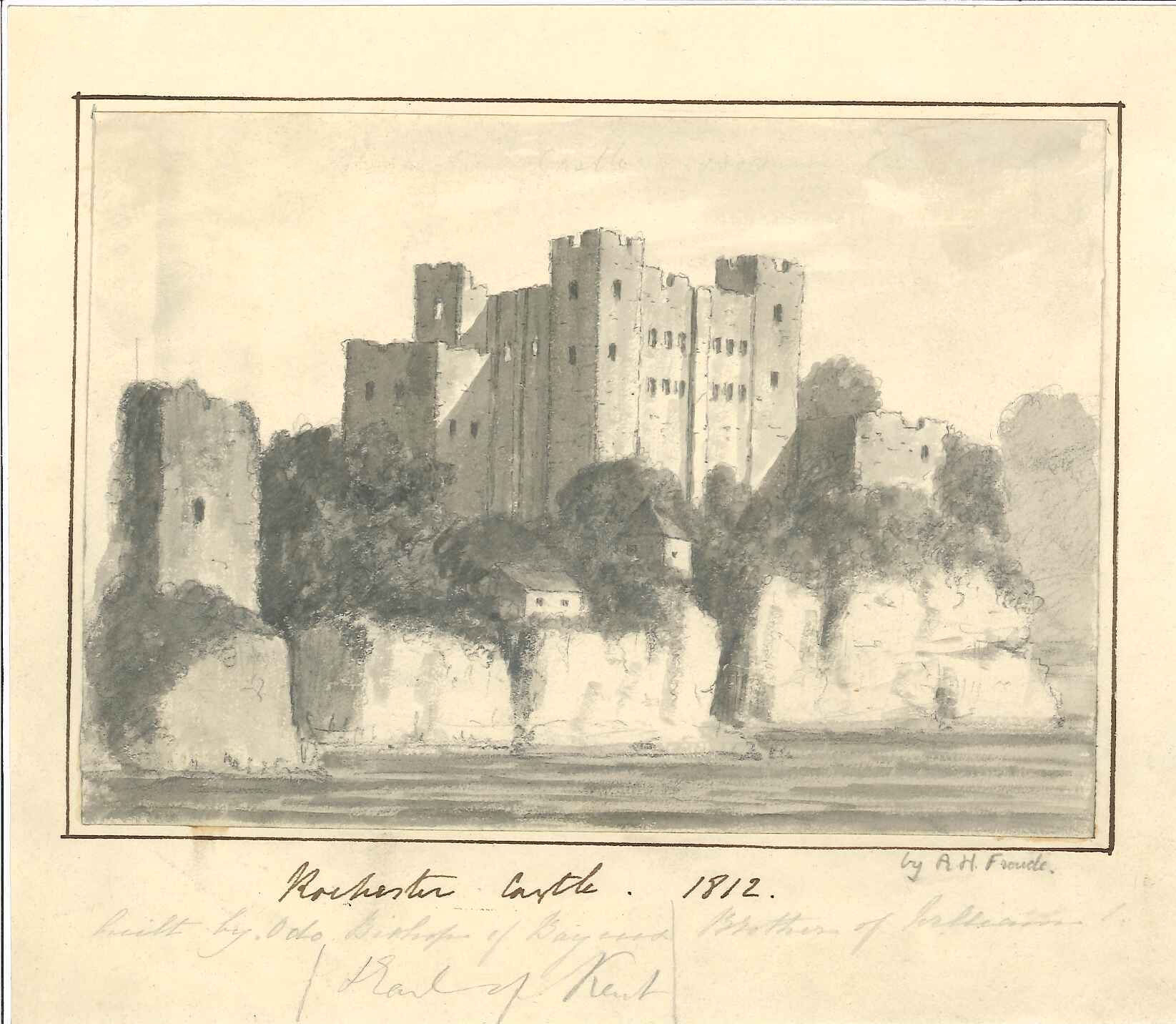 - DescriptionPencil drawing overlaid with grisaille watercolour; Rochester castle from the river, looking south-east; shows shore before esplanade was built; by R H Froude; unframed. The artist was the Archdeacon of Totnes and father of the famous Victorian writer Richard Froude.
