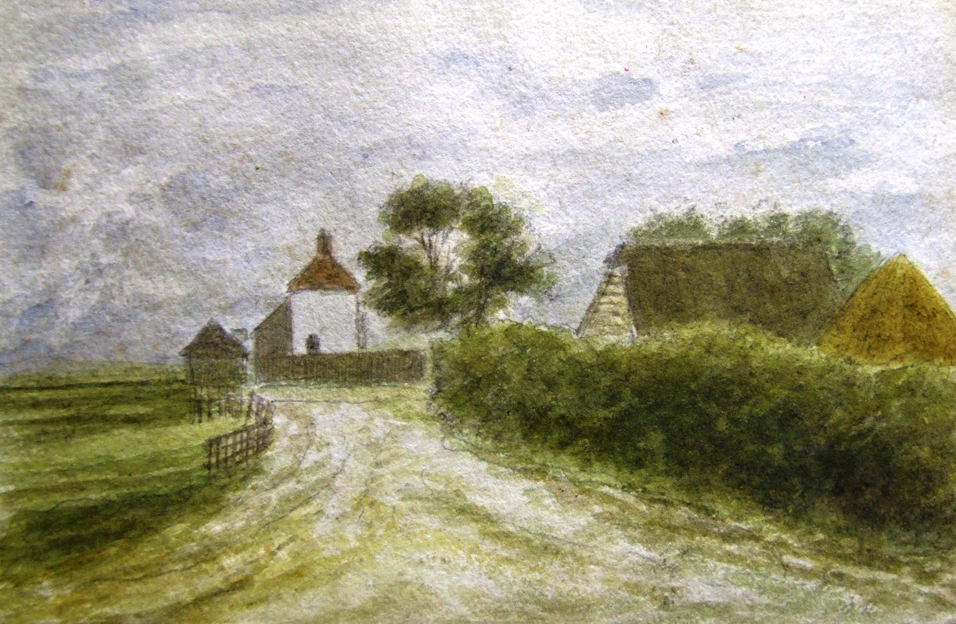 - DescriptionWatercolour sketch; small quite crude amateur sketch showing roadside view of a cottage & barn at Cliffe. In an album of 210 sketches. Artist known as 'C' (or possibly 'C.F.N.), a Cliffe resident. Sketches were painted between 1864-1911; 1860's/70's of some Surrey/London locations, 1880's/90's Medway & Hoo peninsula; added later pencil comments by artist.