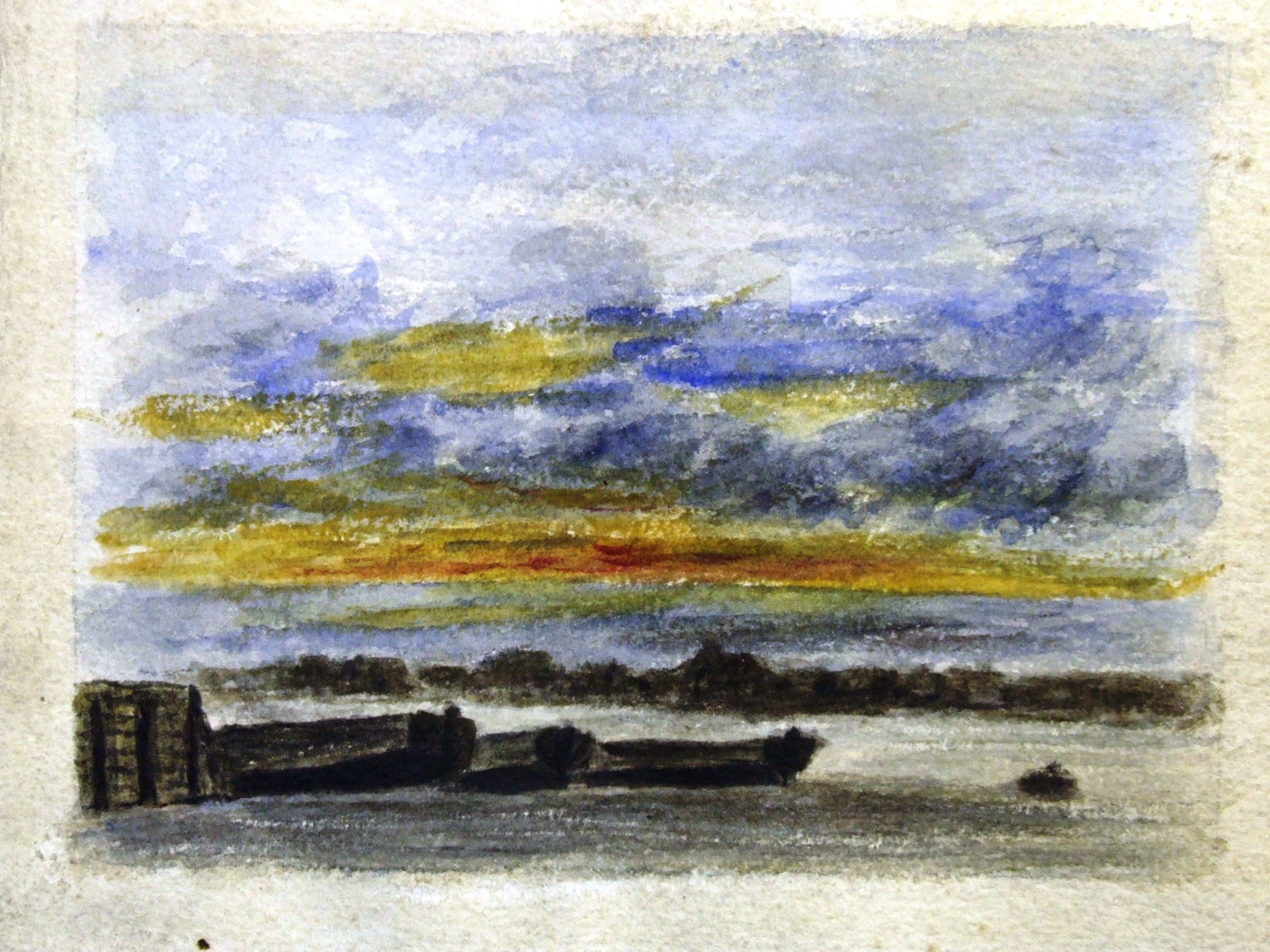 Watercolour sketch; small quite crude amateur sketch showing a simple sunset view of the Thames at Nine Elms; shows some form of embankment & jetties?. In an album of 210 sketches. Artist known as 'C' (or possibly 'C.F.N.), a Cliffe resident. Sketches were painted between 1864-1911; 1860's/70's of some Surrey/London locations, 1880's/90's Medway & Hoo peninsula; added later pencil comments by artist.